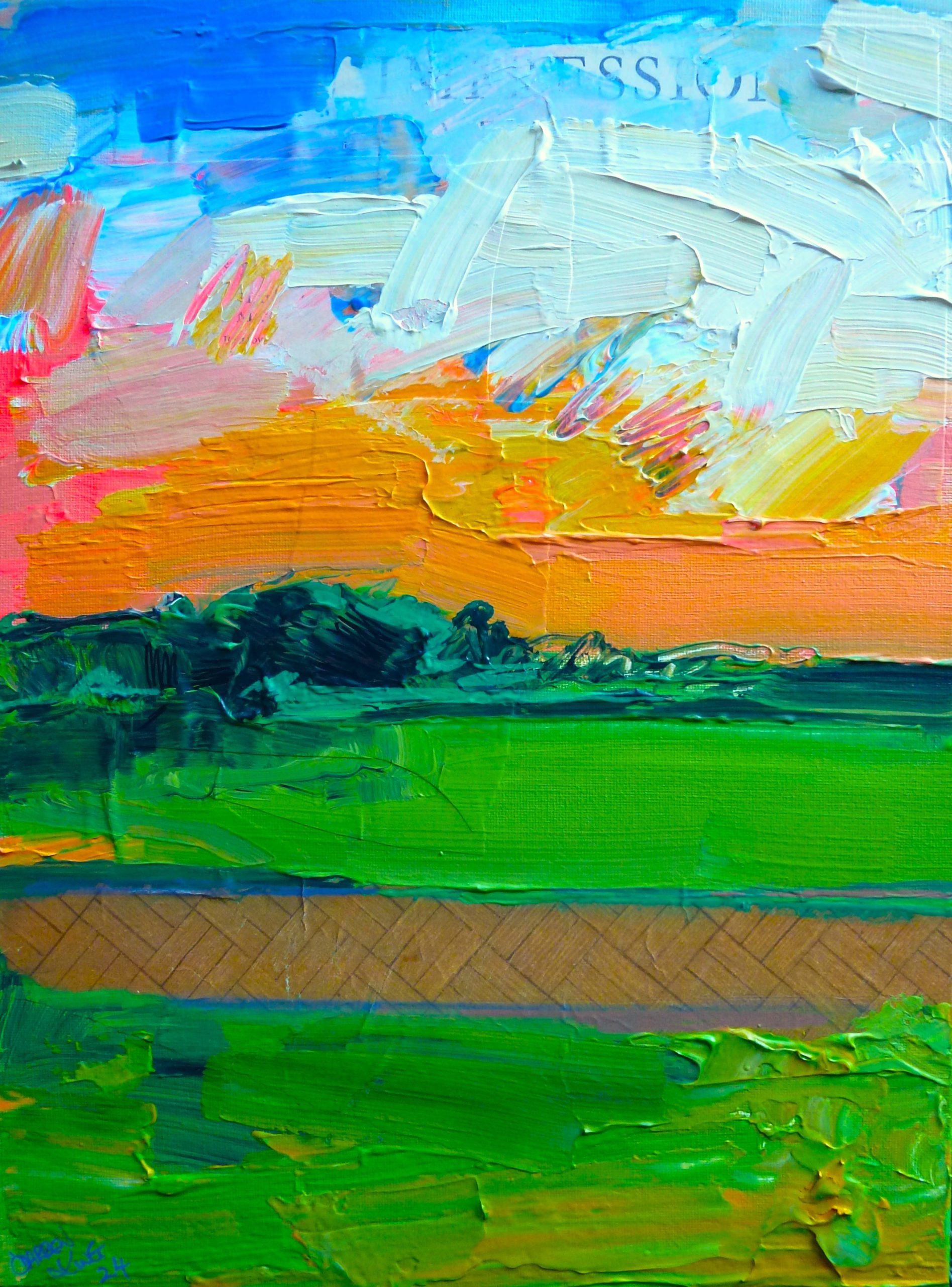 A loose, abstracted landscape brought to life with bright colour and thick, gestural brushstrokes.