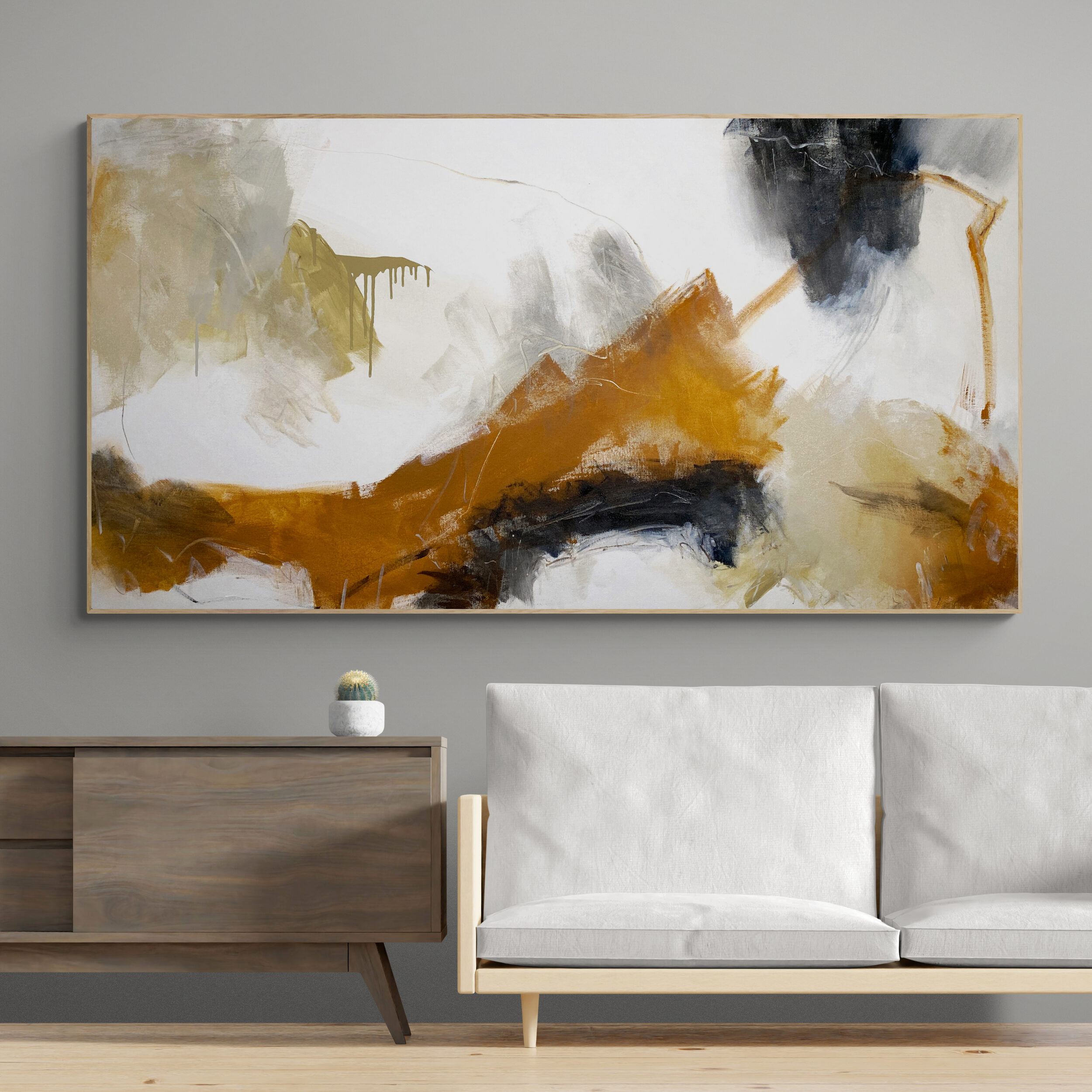 Its vibrant palette of light warm beige and browns, grey, bluey black and white makes the bold mark-making in this piece come alive.