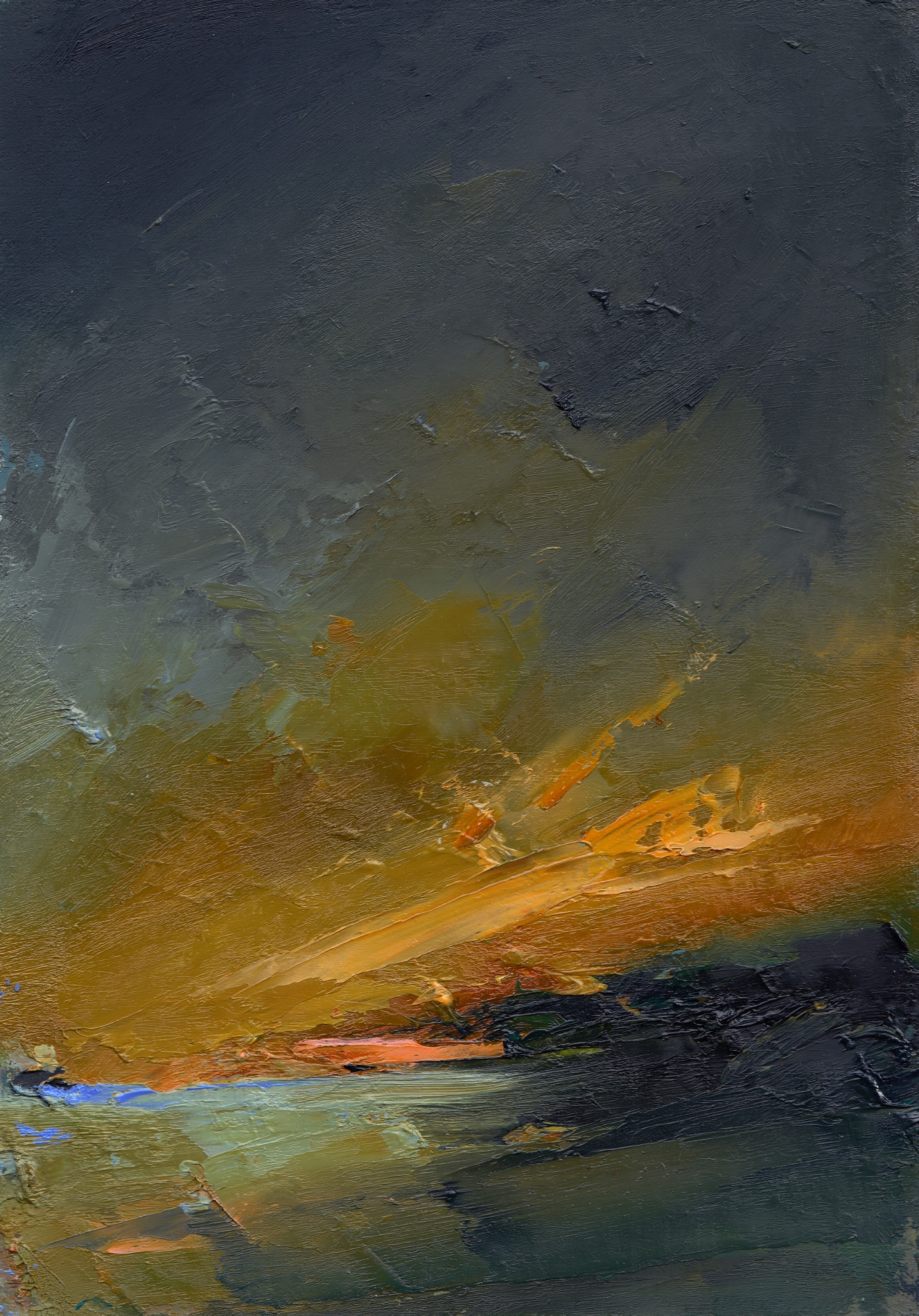 Distant Silhouette – A revisit of this striking colour palette, which sometimes I worry might be a little too bold, but I feel it fits perfectly with the dynamic movement of the clouds depicted. In this painting we see a distant coast, hilly and dark, as the sun sets in a streak of bright orange and pink. For that brief moment, the sky becomes ablaze, and we know that not more than a few minutes later, the sun will set and all will be dark.