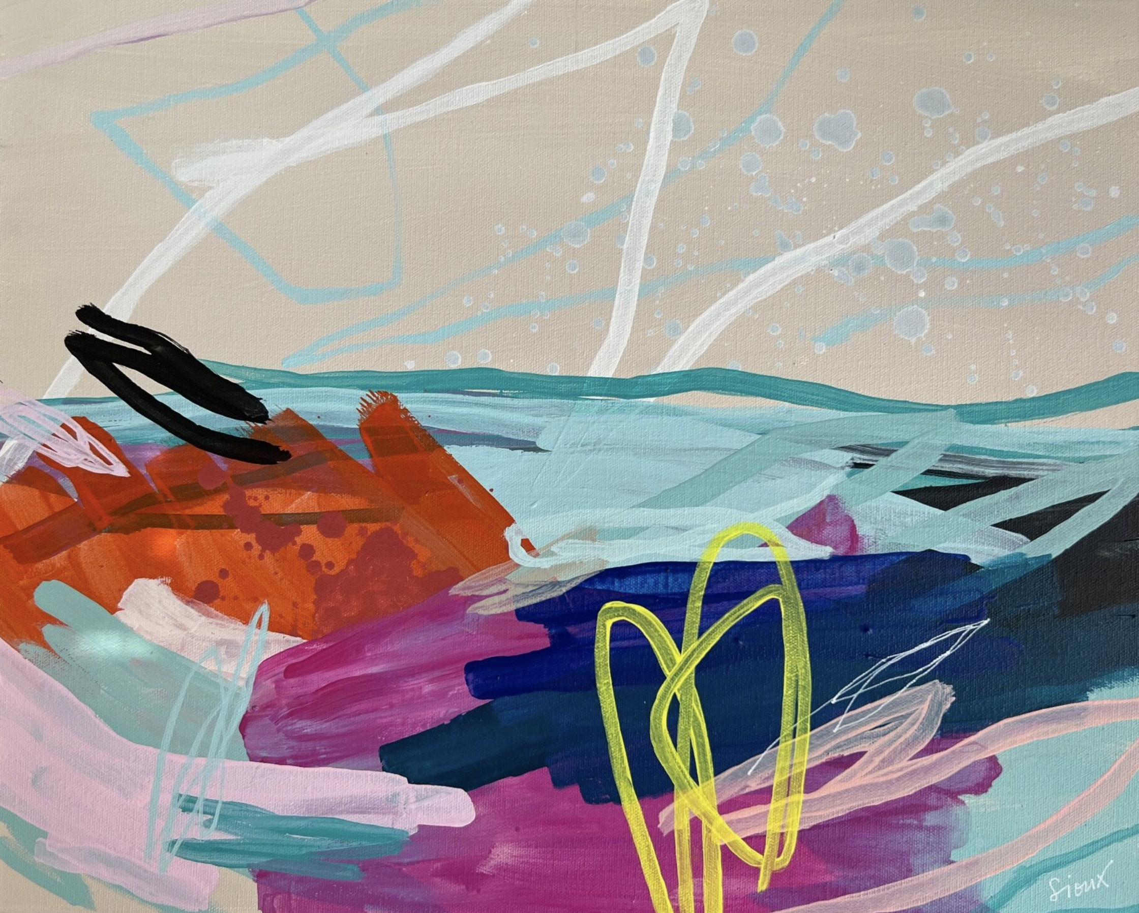 Influenced in part by the ocean, which never ceases to inspire and delight. This is one of a few small paintings I’ve been working on in the studio in between big public art projects. Changing in scale from painting a 50m long mural on the road to this small canvas was a challenge. Instead of painting with a 270mm roller and using my whole body, I used tiny paint brushes, each stroke being quite deliberate. So while it is an abstraction, there are many considerations such as palette, form, scale, composition, line etc. Enjoy!