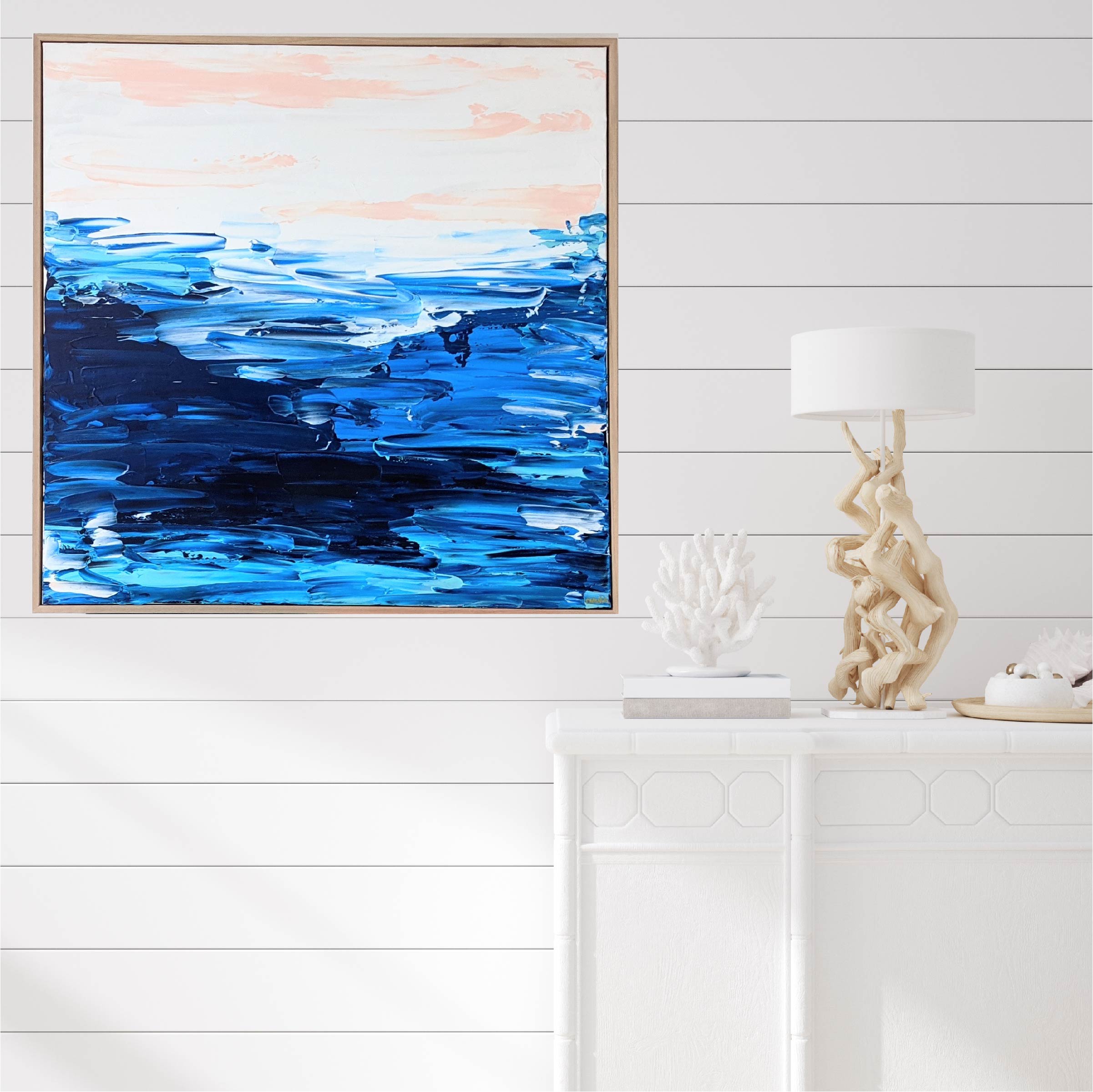 Acrylic on hand stretched canvas framed in a Tasmanian Oak floating frame.