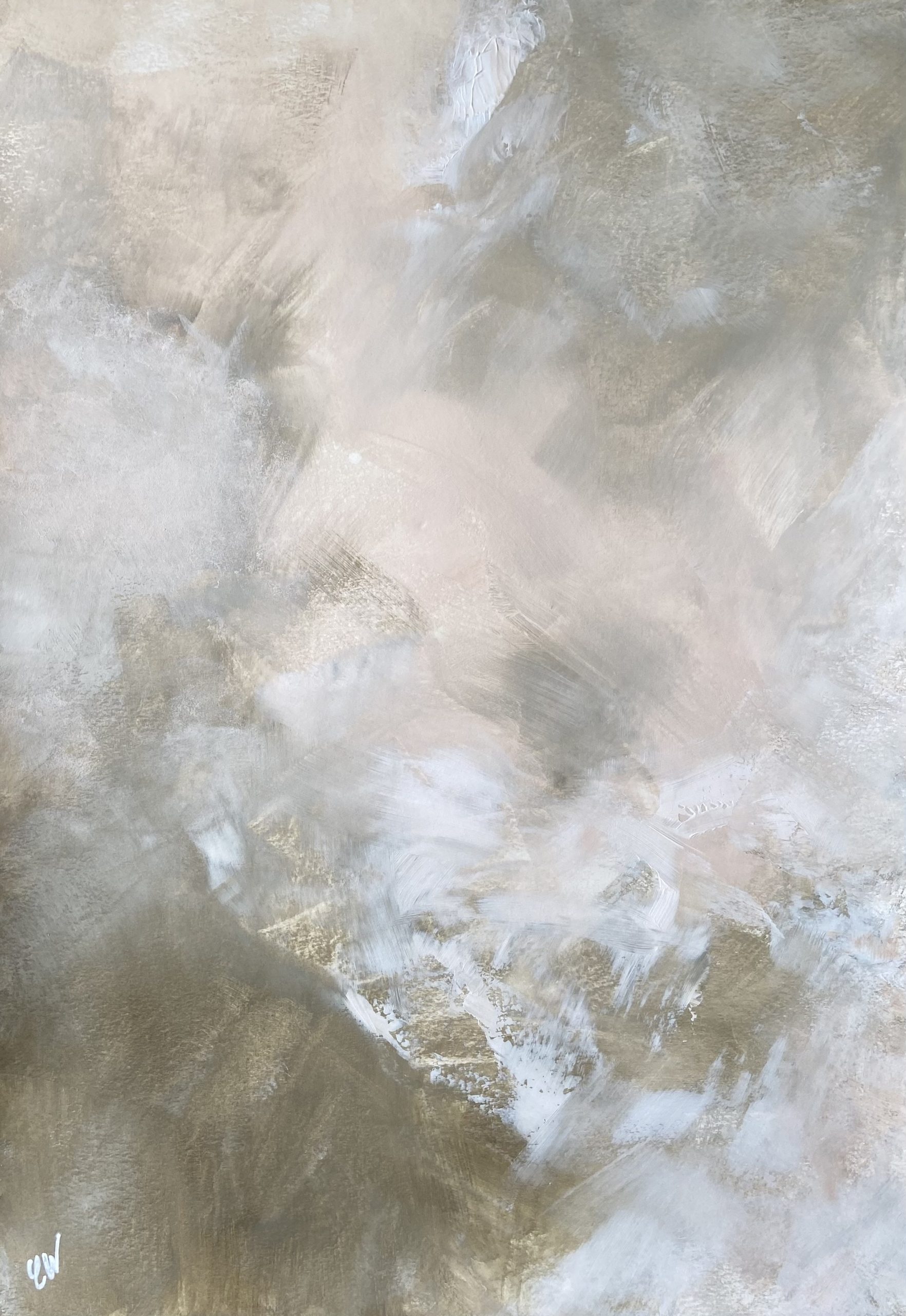 A beautiful abstract painting with a soft green, peach and white palette. 59.4 x 42 cm (A2 size). Acrylic on paper. Frame not included. Requires framing.