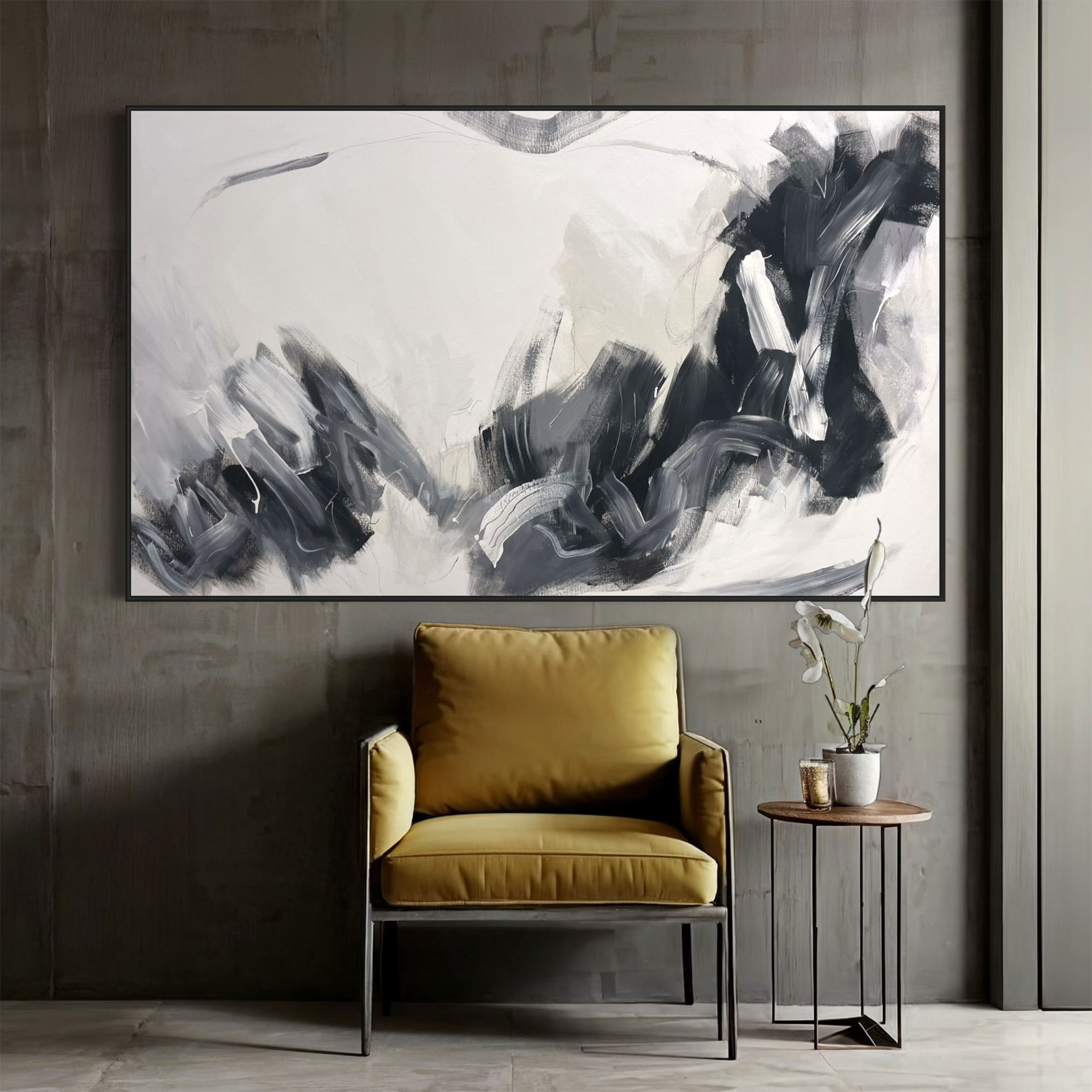 This large painting has areas of texture and gestural marks in paint and pencil across the canvas surface. It’s striking monochromatic palette consists of black white, grey with a hint of neutral beige.