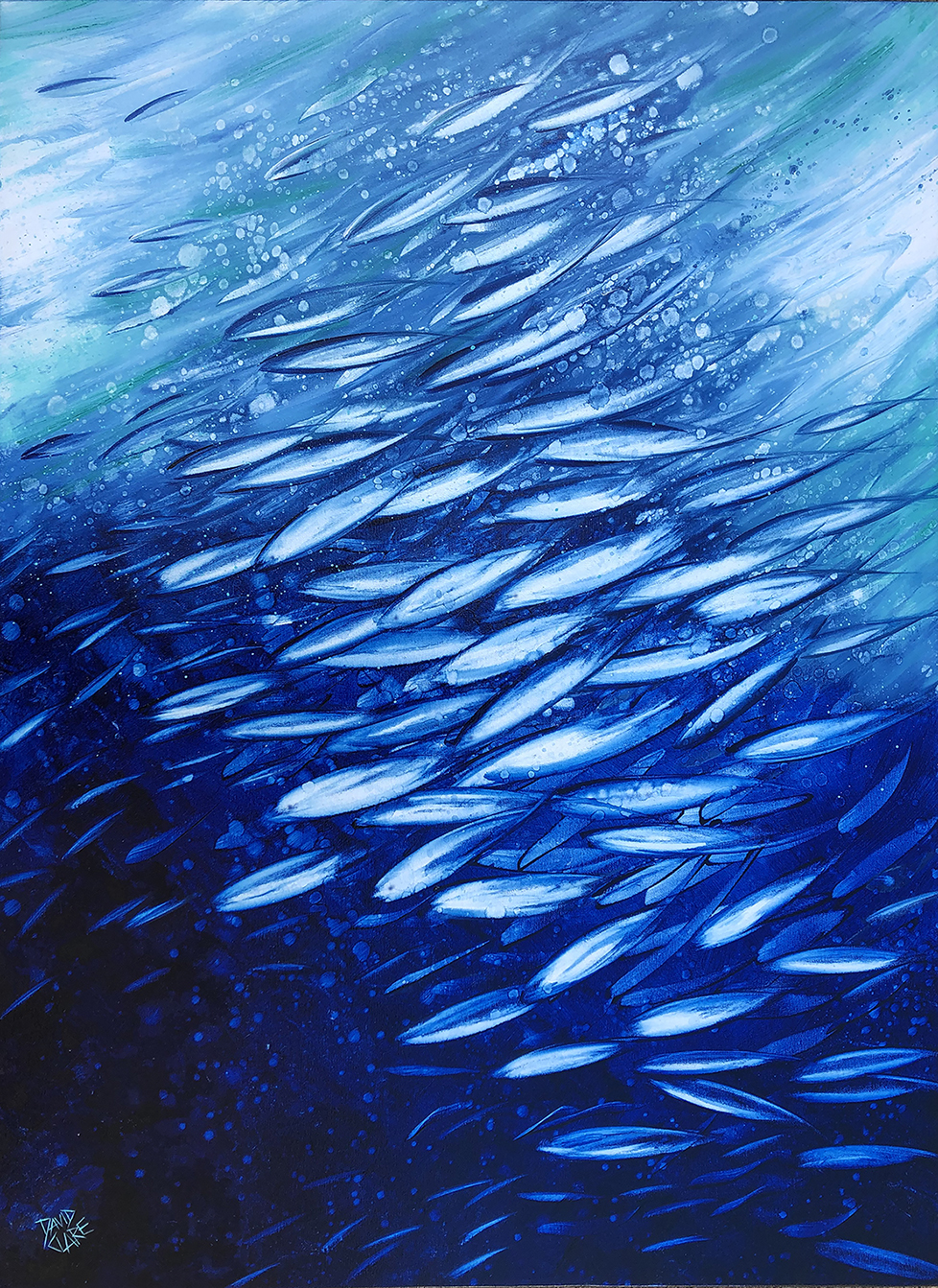 Diving Into The Deep by David Clare – Oil painting of fish in deep blue ocean, on thick stretched canvas, ready to hang.