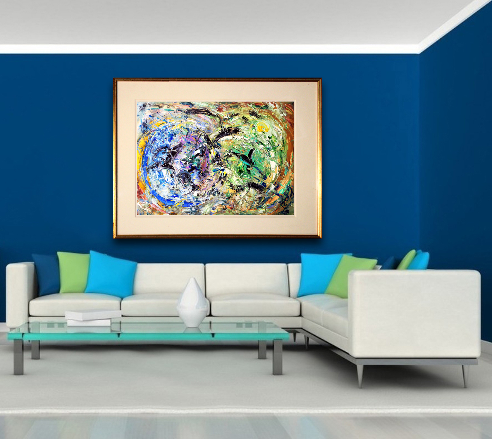In the photos, where the painting is shown mounted on a wall, these are purely for illustrative purposes. You should review the dimension of the artwork to be sure the work suits your needs. In the case when a painting is sold without a frame, of course, you can add a frame of your choosing and so it will add to the overall dimensions.