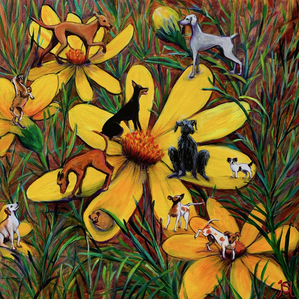 Recently I was reading a novel, which had a description of someone walking amongst the ‘dog weed.’ As I had no idea what ‘dog weed’ was, I researched it and found that they were clumps of bright yellow flowers, which come in different sub species of plant throughout many parts of the world. One thing led to another and the idea for this painting came to mind and I have placed a variety of dogs amongst the petals of the bright yellow flowers.