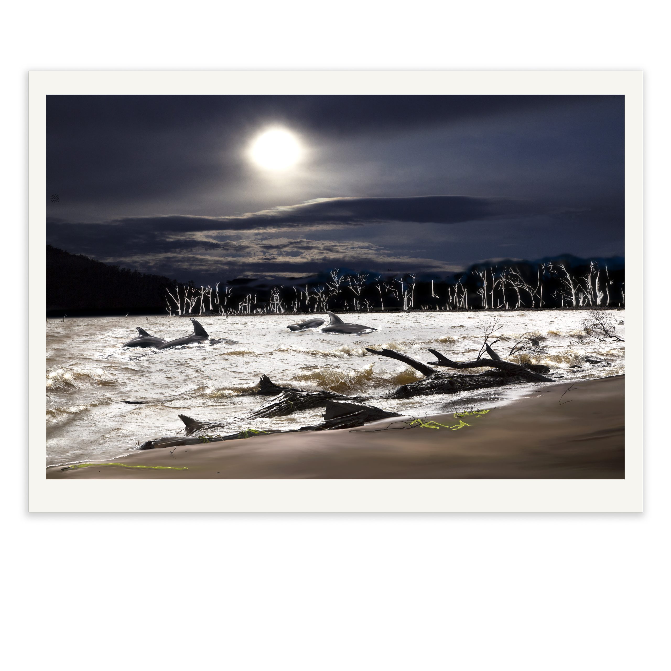Ghostly silver trees line the horizon. Their dolphin odyssey takes place under the watchful gaze of a fog-covered moon, rising above the horizon.
