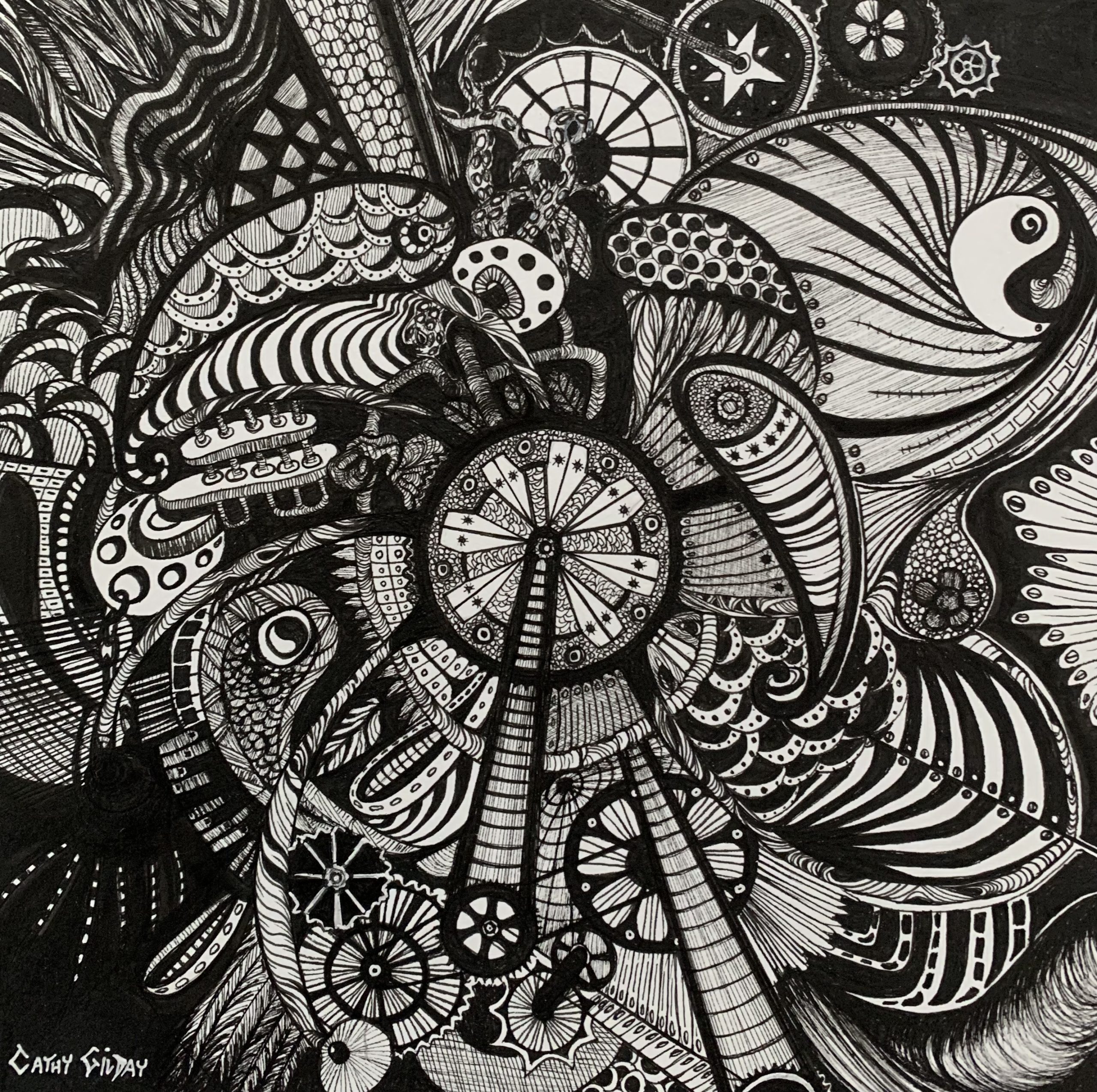 Don’t Ask by Cathy Gilday –Â There’s so much going on around the world at present. Watching the news and hearing about events unfolding can sometimes be overwhelming and it seems like there’s an overload of information…. almost too much to process and certainly keeps the cogs turning. I think it’s really important for people to be able to express their feelings and vent. I do this through my artwork. I’ve spent the last week creating this abstract drawing which has been quite cathartic and a great stress relief. I used Micron ink pens to create an intricate fantasy drawing, which has many complicated elements. Requires framing.