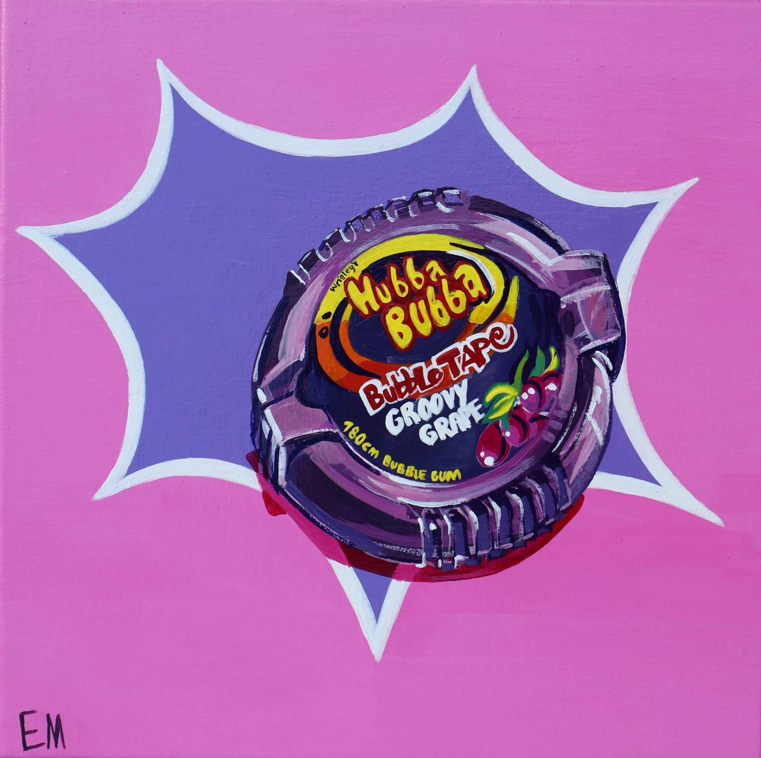 “Don’t Burst My Bubble” is the perfect title for this Hubba Bubba tape painting.