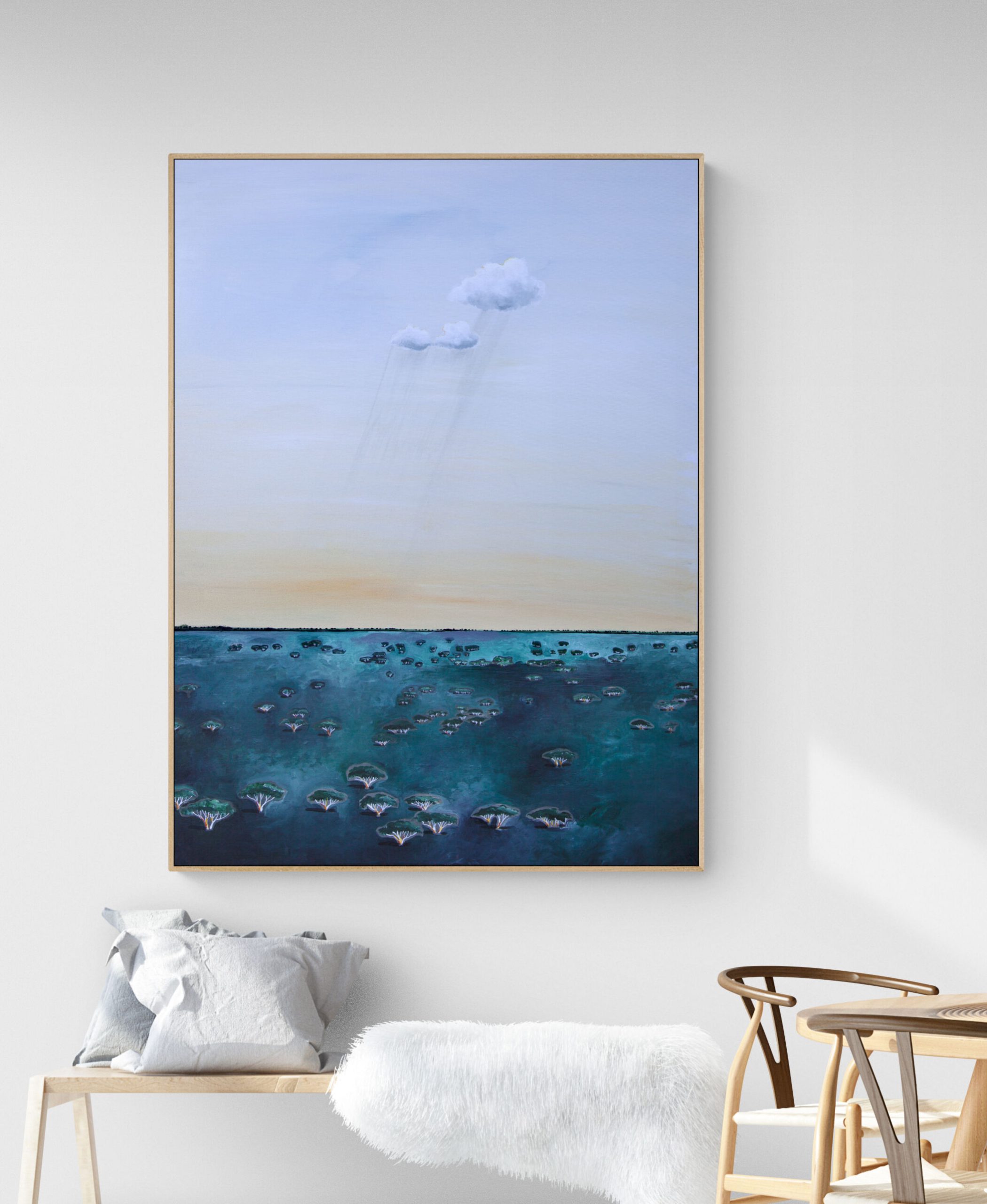 Don’t Cry Little Ones by Tania Chanter  is inspired by the atmospheric Australian sky and the changes of light and mood throughout the day. Tania’s hope is that this painting brings a sense of calm to the room where it lives, and that is makes the people who enter the room feel as though a part of nature is right there with them.