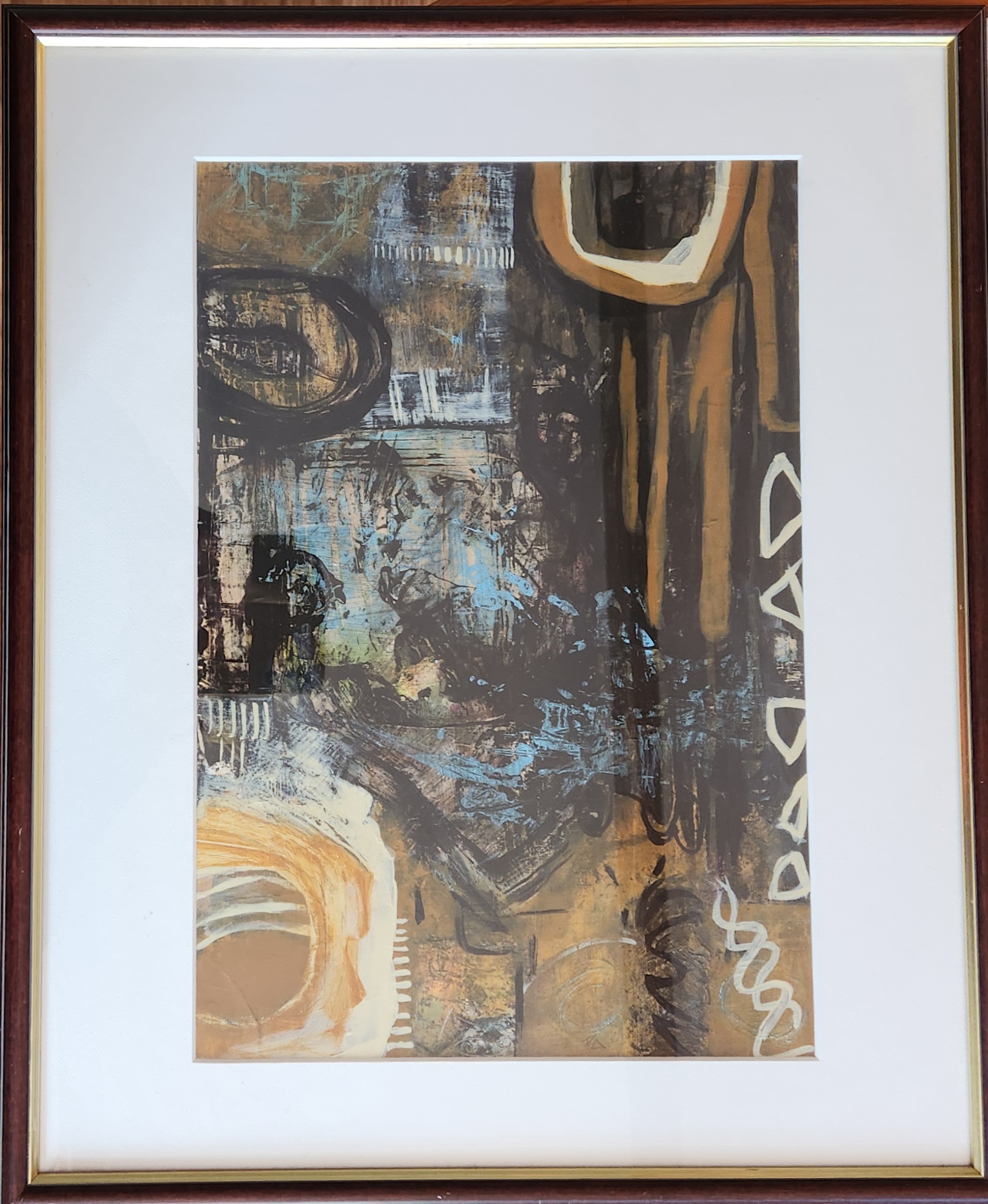Don’t judge a book by it’s cover by Paola Ditel – Inspired by abstract on paper deep colours with blues for accent colour and some neutrals. Working quickly putting shapes texture and colour down on small surfaces or substrate . Intuitive artwork piece. Paper size is 30 x 40cm. Piece has high quality framed with glass. Deep red brown framed.