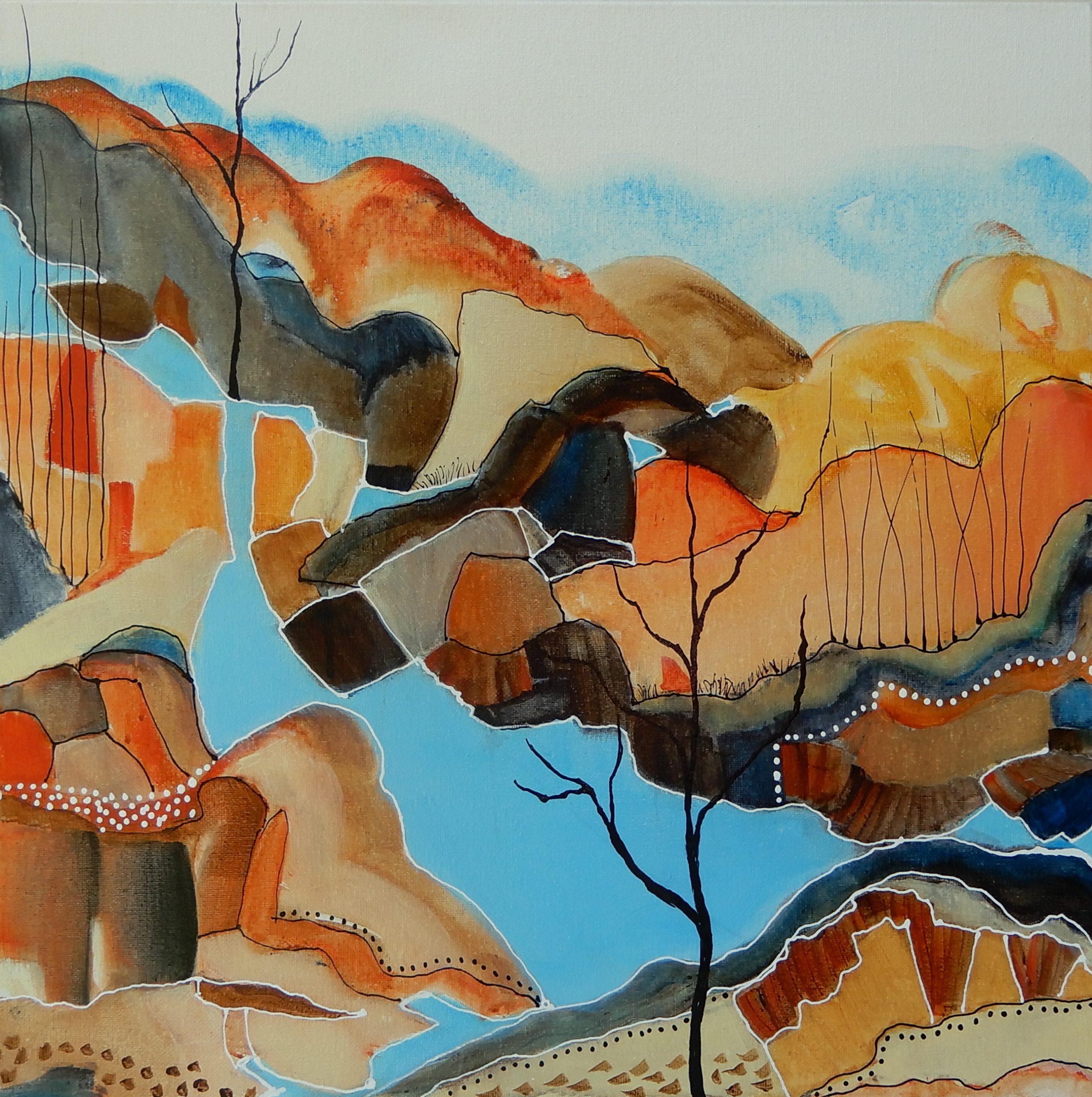 I wanted to capture the drama of water falling over boulders and rocks, using a very cool blue the colour of a spring sky against the earthy tones of the Australian landscape.