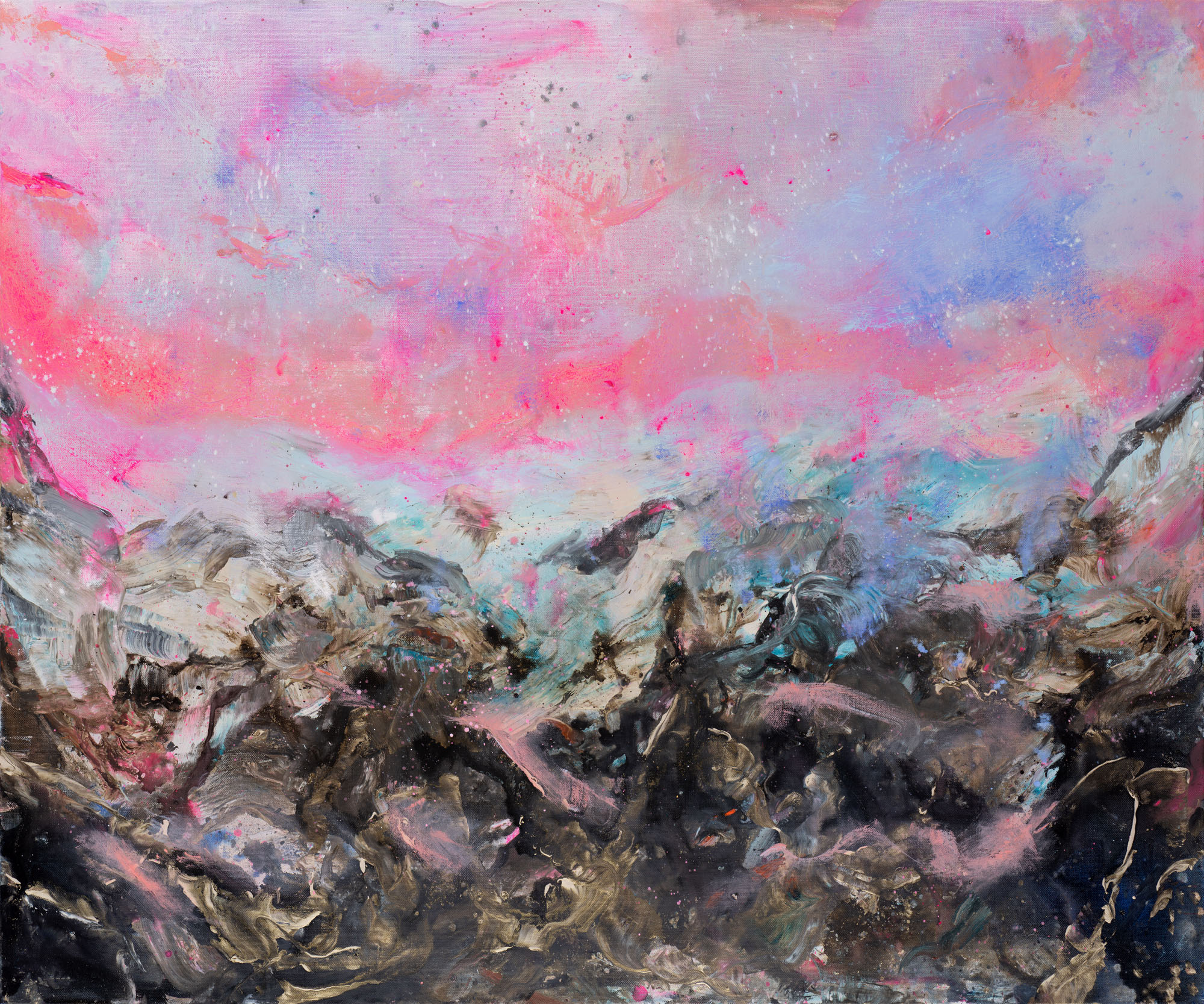 A bright abstracted landscape created to bring happiness and joy to YOU! Bright colours have been researched and said to trigger a dopamine release in the brain, which is exactly why I painted this piece. This piece is inspired by a neon sky over the mountains. Those extra special, bright pinks splashing across the sky at sunset turning the world into a truly magical scene.