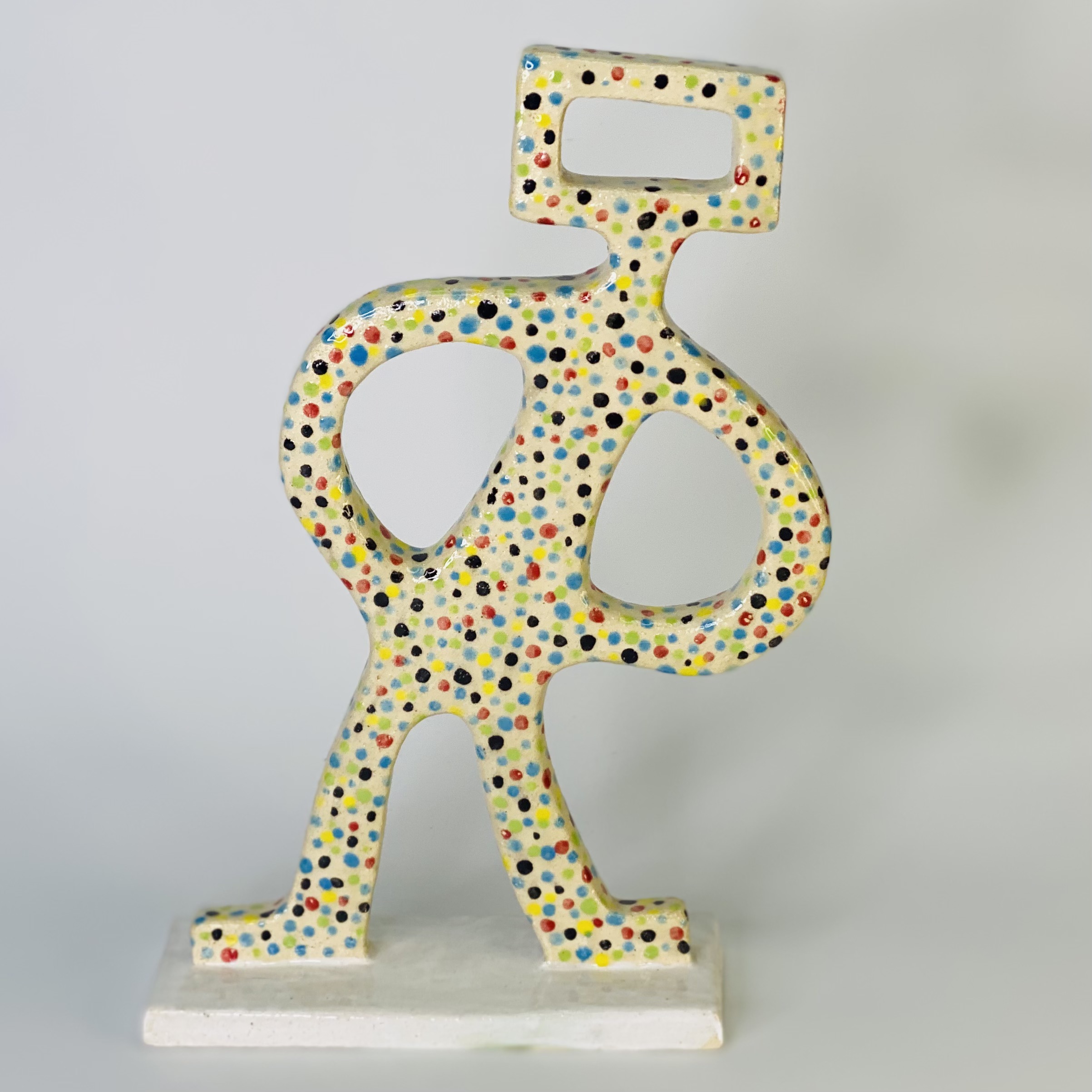 Inspired by Sydney Nolan’s Ned Kelly design. The ceramic figurine displays Ned in a dynamic pose, full of movement and fluidity. Hundreds of dots, glazed in different colours add a ghostly quality. A special work.