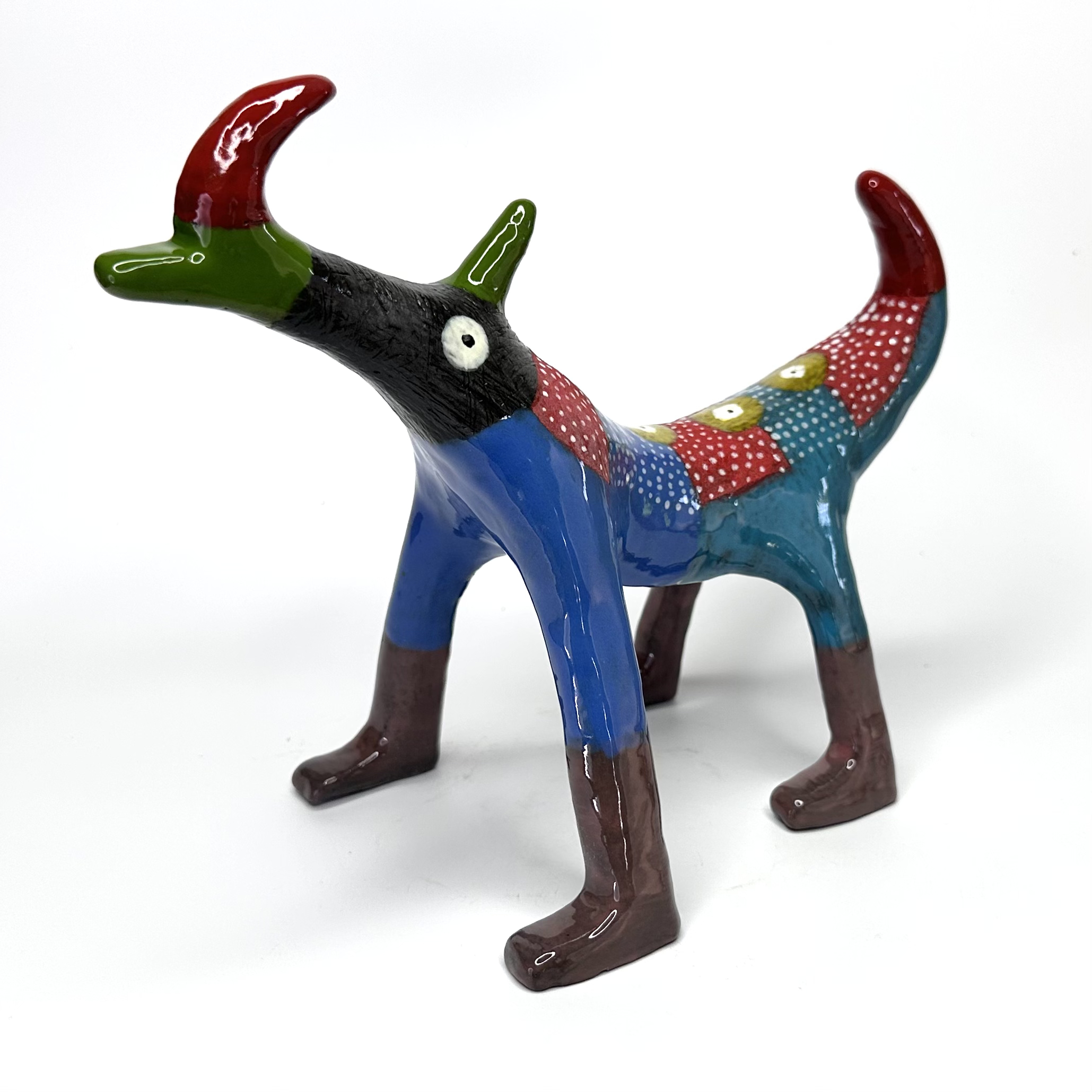 Here is a fantastic creature with long legs, a cobalt blue body, a striped back and two improbable horns.