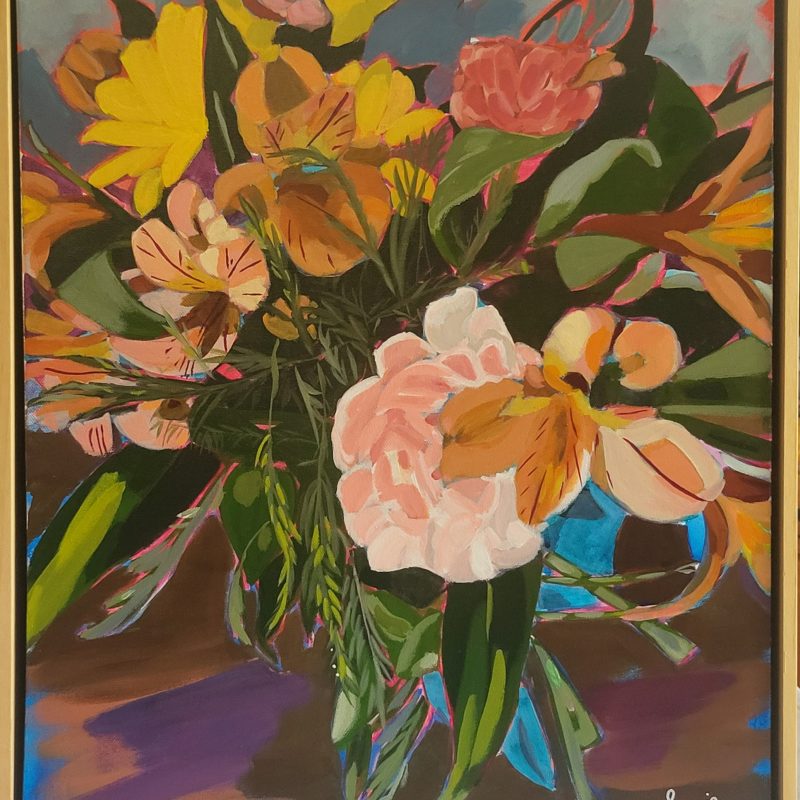 This artwork is an original abstract using acrylic paint and artist markers. This artwork represents all that I love about home being a sanctuary for me and all living things. It is a story about being entwined with nature and harmony. I have used lots of small detailed areas weaving throughout using contrasting textures of patterns and a cheerful and bright colour scheme.