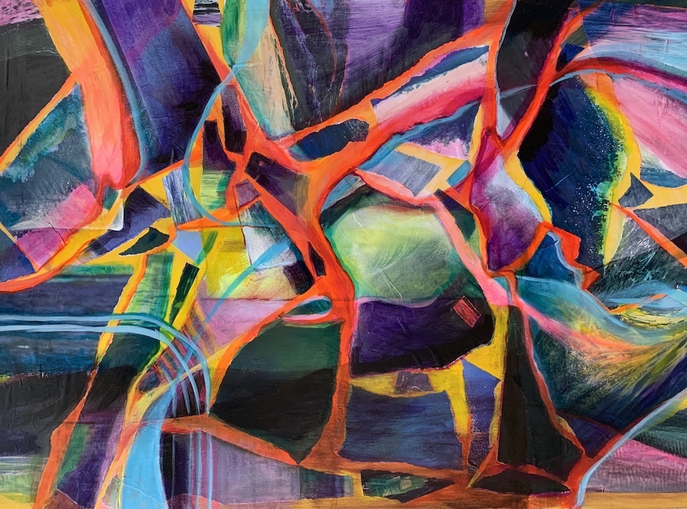 The mediums used are heavy gel medium, paper, acrylic paint and universal medium. The board is unframed and signed at the back.  The brightness of the painting would suit any dark-painted wall. It is ready for framing and can be hung in a landscape or portrait format.