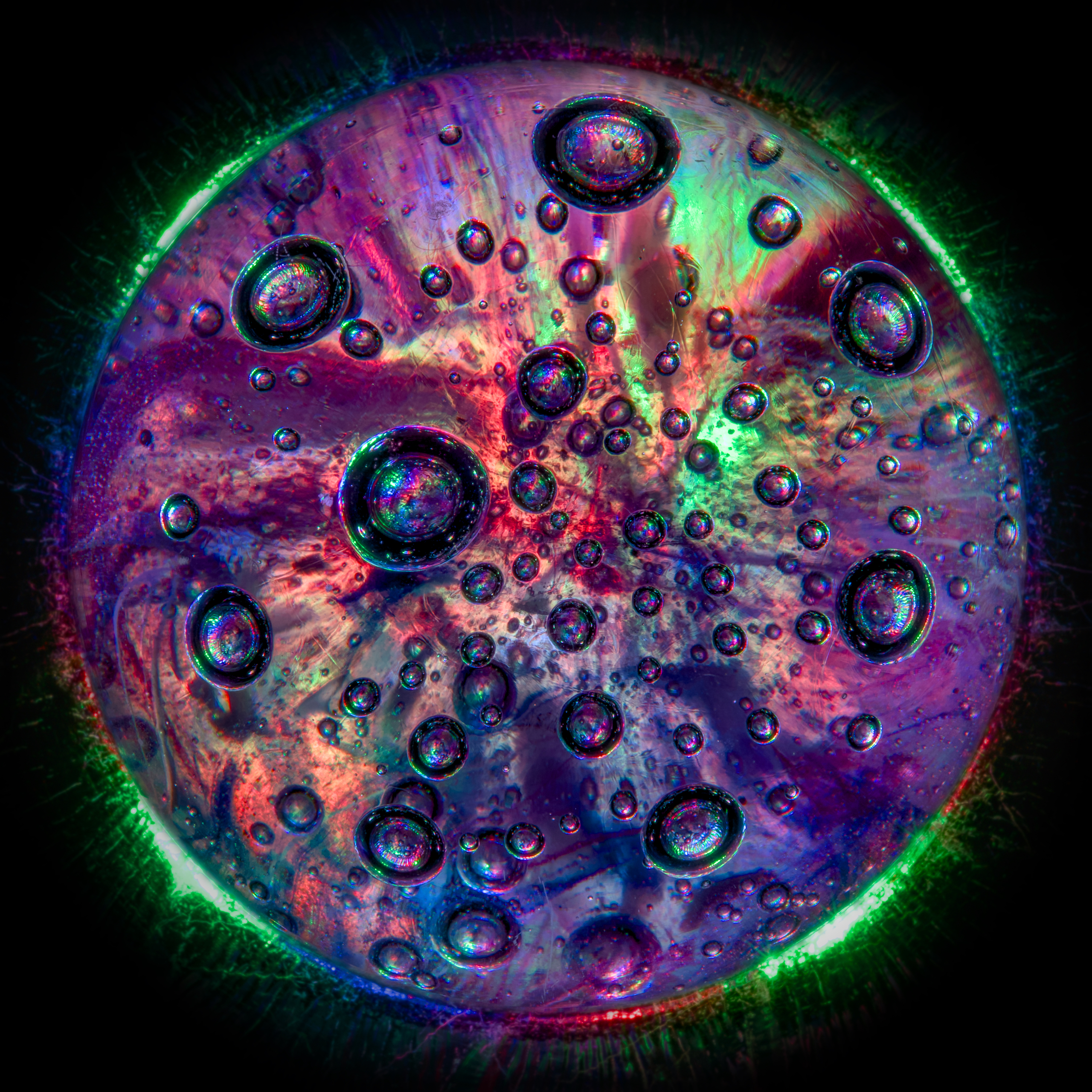 “Drancel Light Art – Glass Bubbles No 2A” by PLAYlogo, created using his unique motion-controlled Drancel Light Art system. Custom electronics capture gestures that control the primary colour proportions, which are then photographed combined with various optical elements. The reflections and refractions also give rise to new colours through light synthesis, like mixing coloured paints.