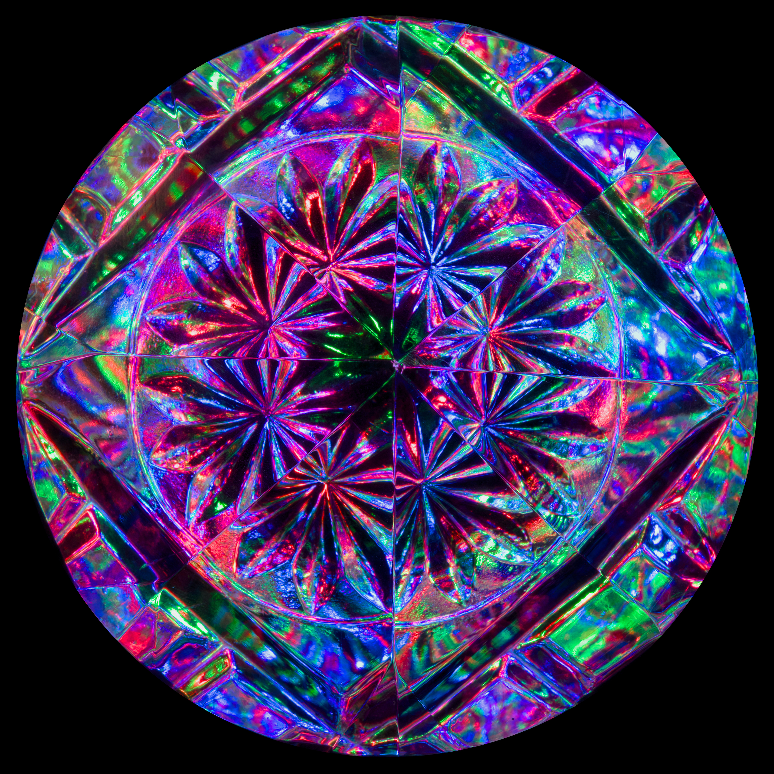 Photographed in high resolution using the renowned Sony FE 90mm Macro G OSS prime lens, this piece features lights through a lead crystal vase with flower patterns combined with an octagonal crystal element. When the octagonal element is slightly off centre, the red, green, and blue primaries combine to give purple and magenta (the scene is therefore deliberately slightly asymmetric). This image additionally employs a digital circle mask.