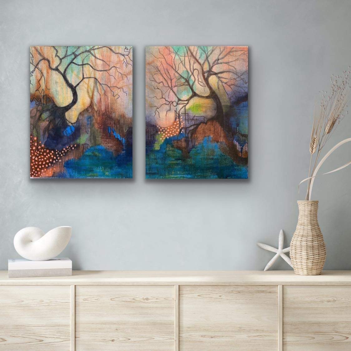 Drought Has Broken by Rosemary Legat – With thoughts of water abstract scenes sneaking into my imagination after completing Waters Edge and Yabby Billabong I moved on to create a further diptych but this duo does create one larger abstract landscape when hung together which is different from my two previous sets.