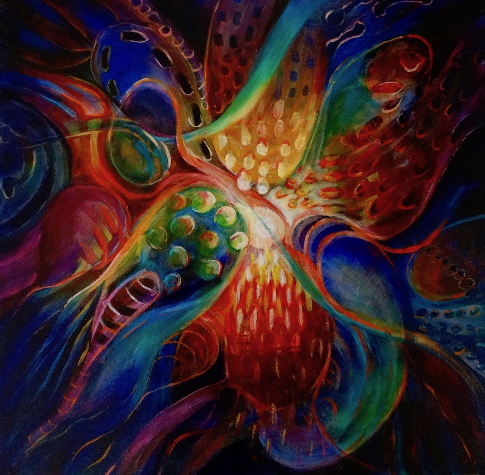 I enjoyed constructing this piece and once I had the general colours and patterning I added the various elements to give the painting a pulsing movement towards the centre where I have painted a lighter brighter area.