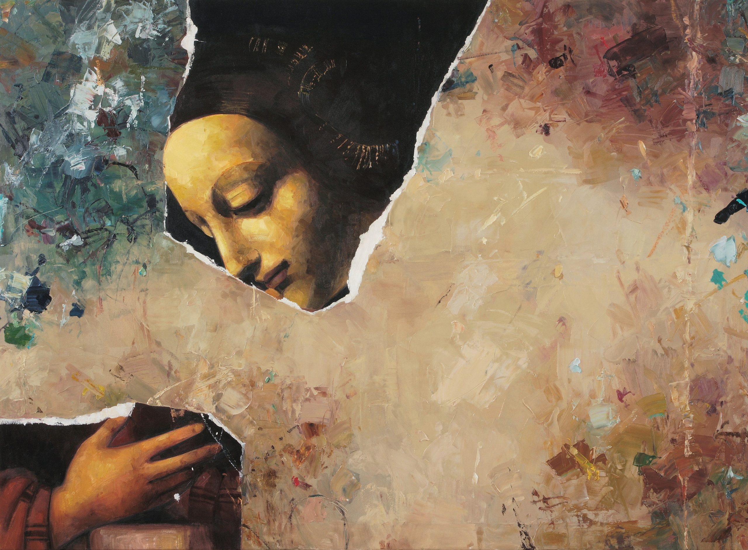 Depicting details from Renaissance art history Dream resembles a distressed wall where only pieces of a painting remain. A woman’s loving gaze and an outstretched hand are fragments left from a much larger story. This large oil painting combines Penelope’s love of figurative art and gestural abstraction.