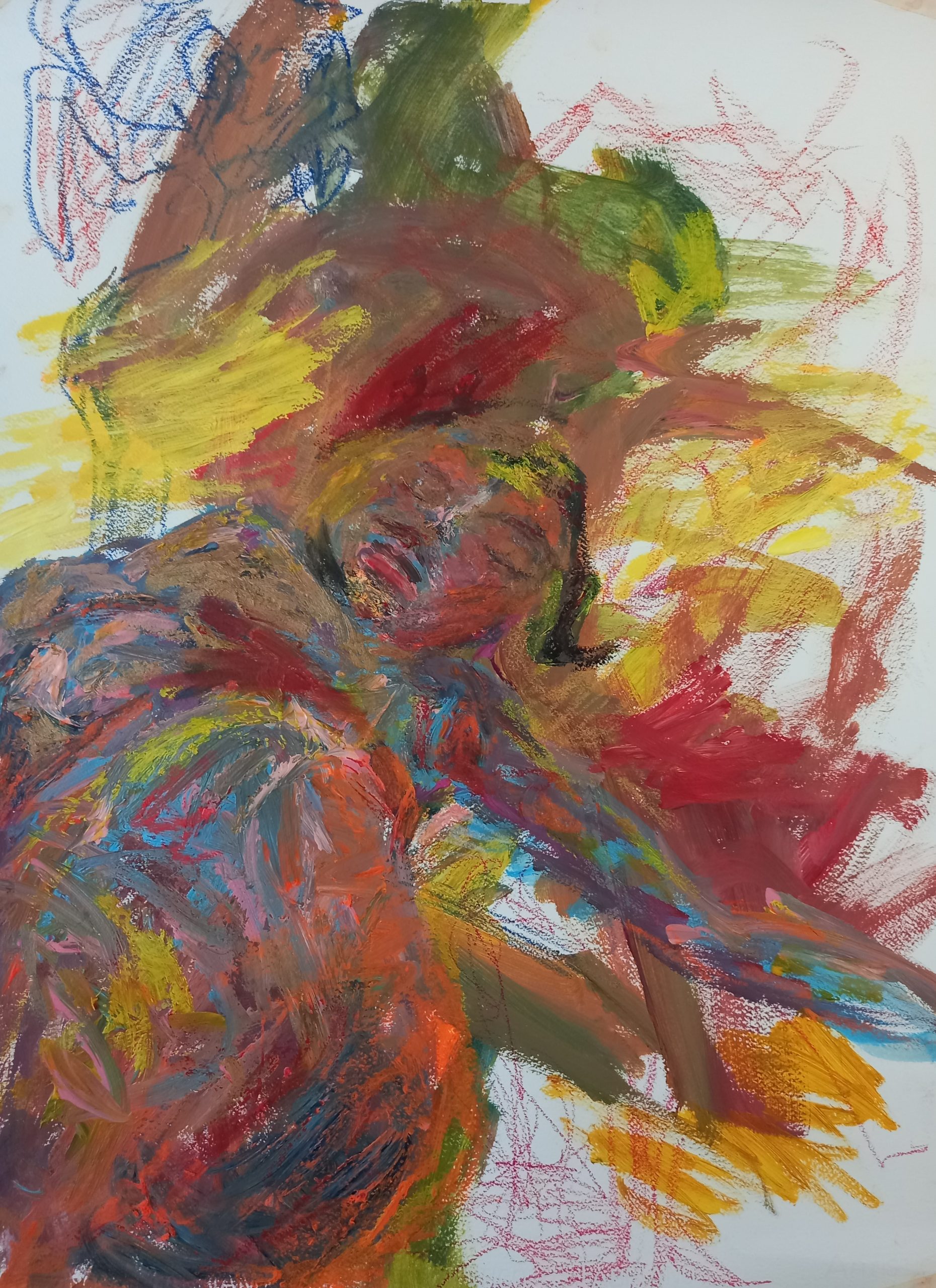 This vibrant piece has a fascinating abstract quality. A loosely painted slumbering figure lies almost hidden within abstract shapes and painterly brushstrokes. There is a beautiful mixture of mediums, adding a rich dimension over paint. An exciting flowing piece that manouvers down the paper.