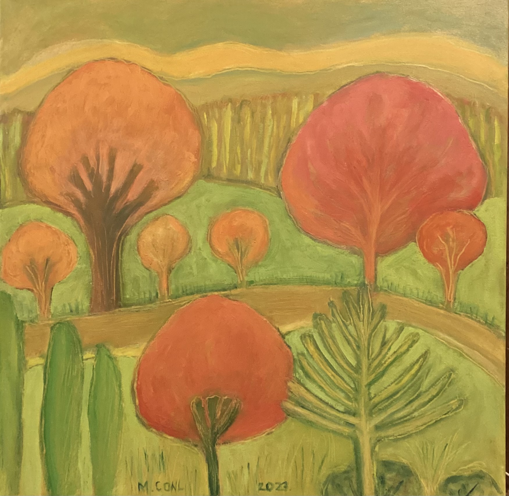 Dream Scape – An original oil painting by Margaret Connell.This abstract image was influenced by Margarets wish to do an abstract image and from her live if the use of bright colours. The painting is on a professionally prepared canvas on frame .Good quality oil paints and gel sealant were used . D hooks are placed on the back of the frame and it is ready to hang .