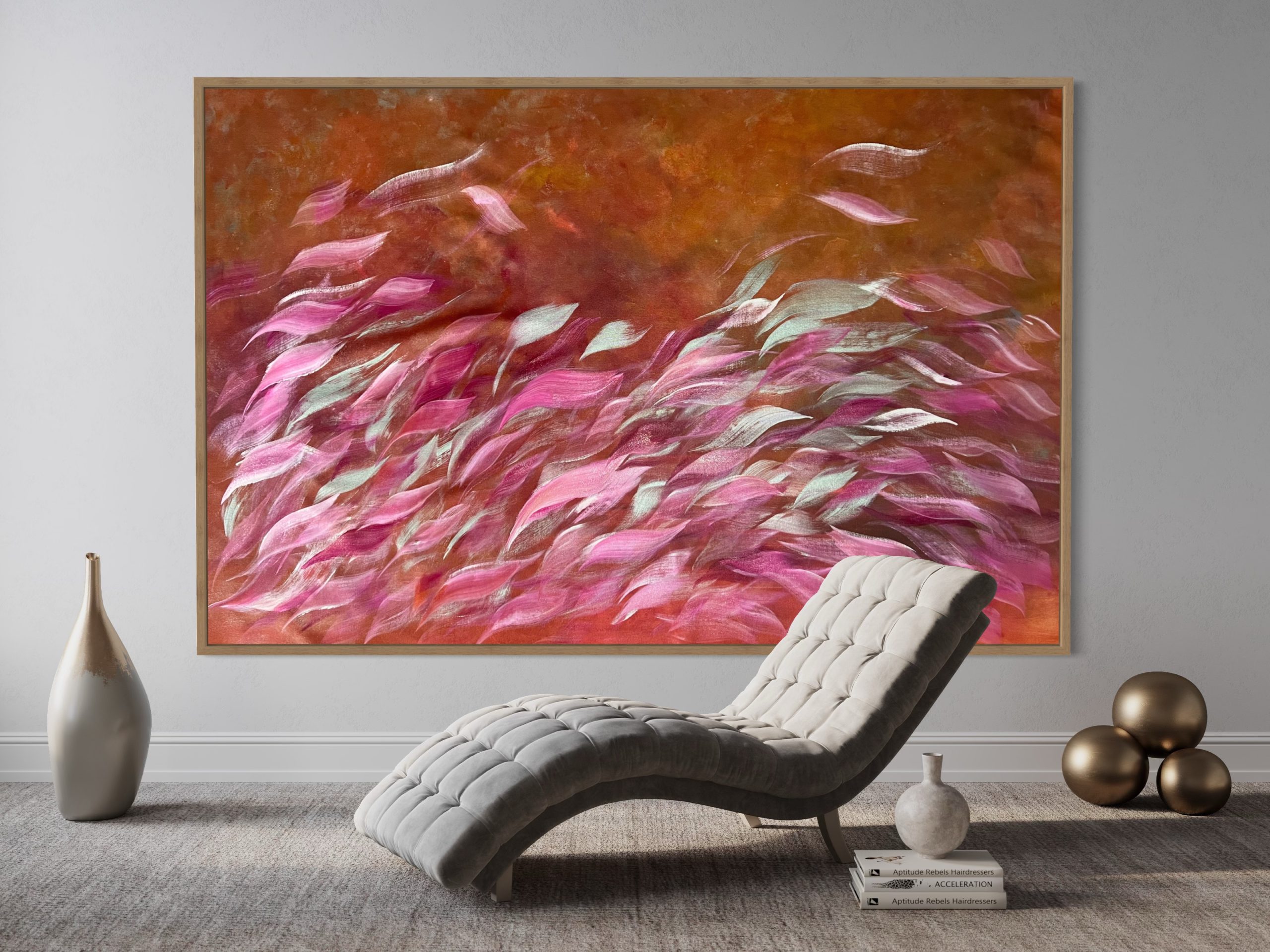 I’ve used Spray paint, metallic and acrylic paints to create this painting, varnished in gloss for protection and luster. This large painting is made with love and high spirits!