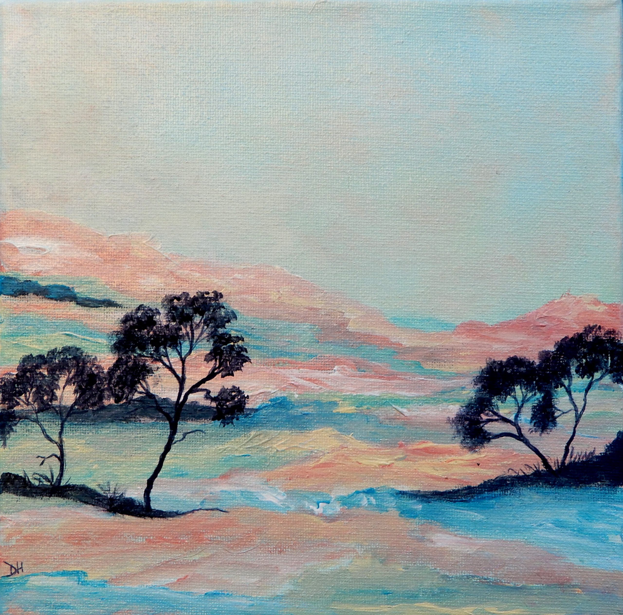 Inspired by distant views of the Flinders Ranges, reds turned to pinks against the blues of distant hills.