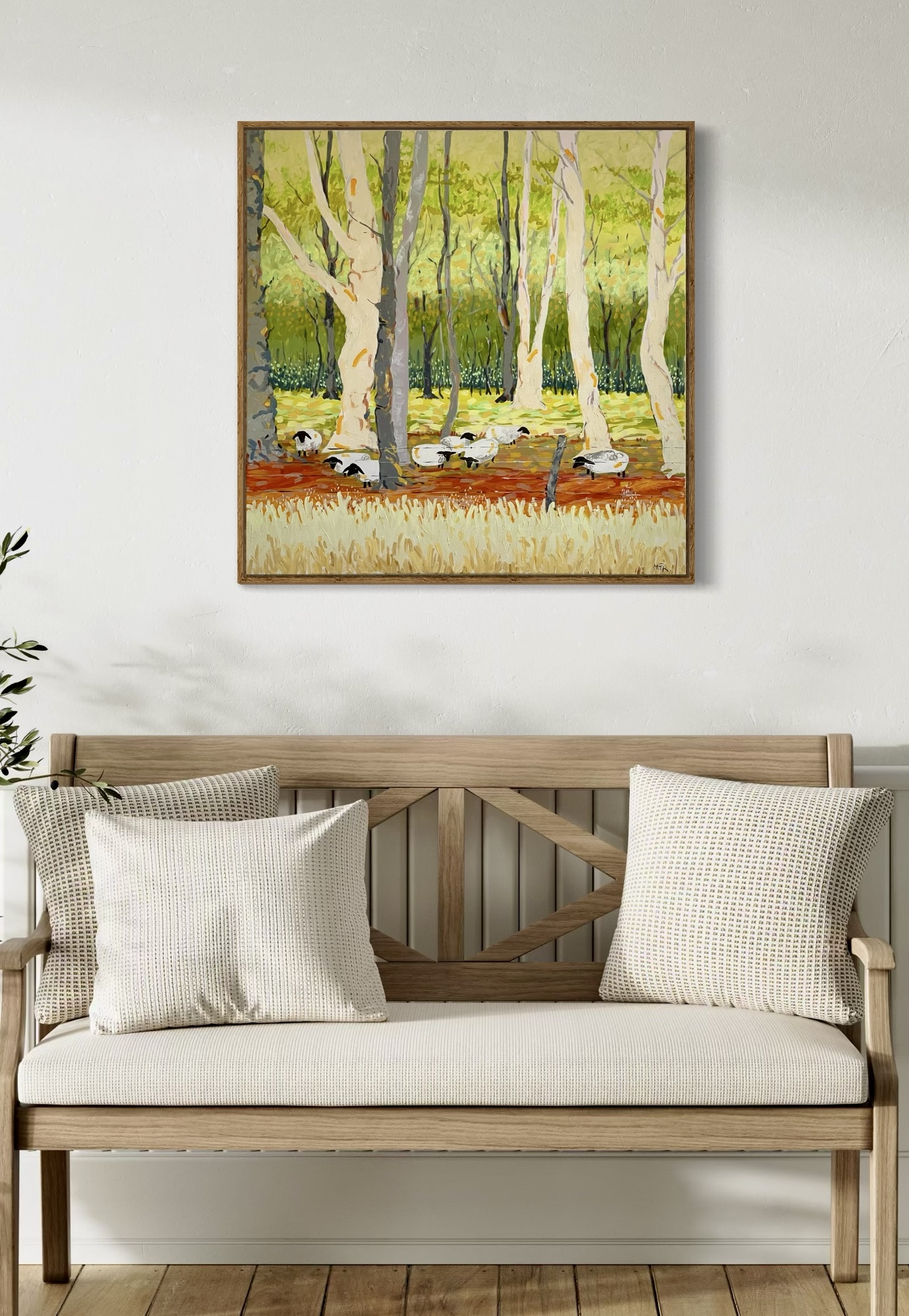 In soft dappled paddocks sheep graze contentedly. This work has been created using thick acrylic paint on a stretched canvas. The colour palette oozes calmness and joy.
