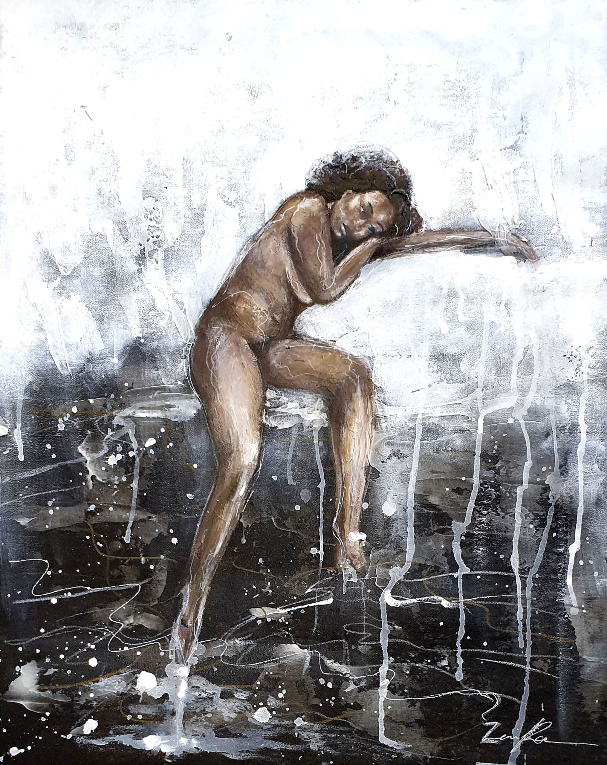 An acrylic and mixed media painting of a nude woman on rolled canvas, by Sydney artist Leni Kae. The woman is dreaming with eyes open, toes in the waters of consciousness. It is symbolic of the journey of lucid dreaming and awakening to new levels of consciousness.