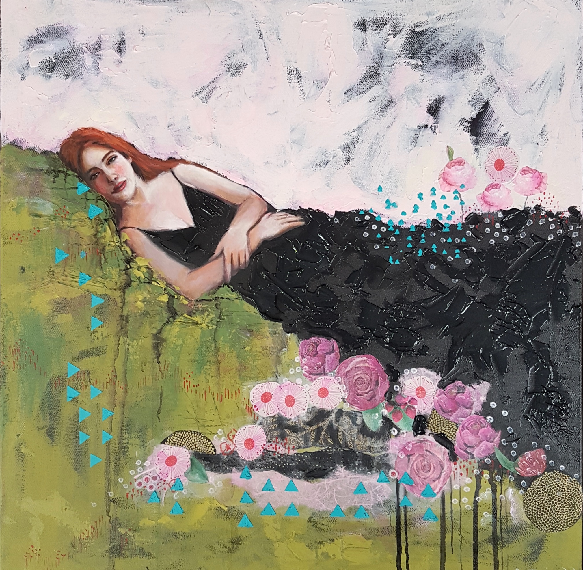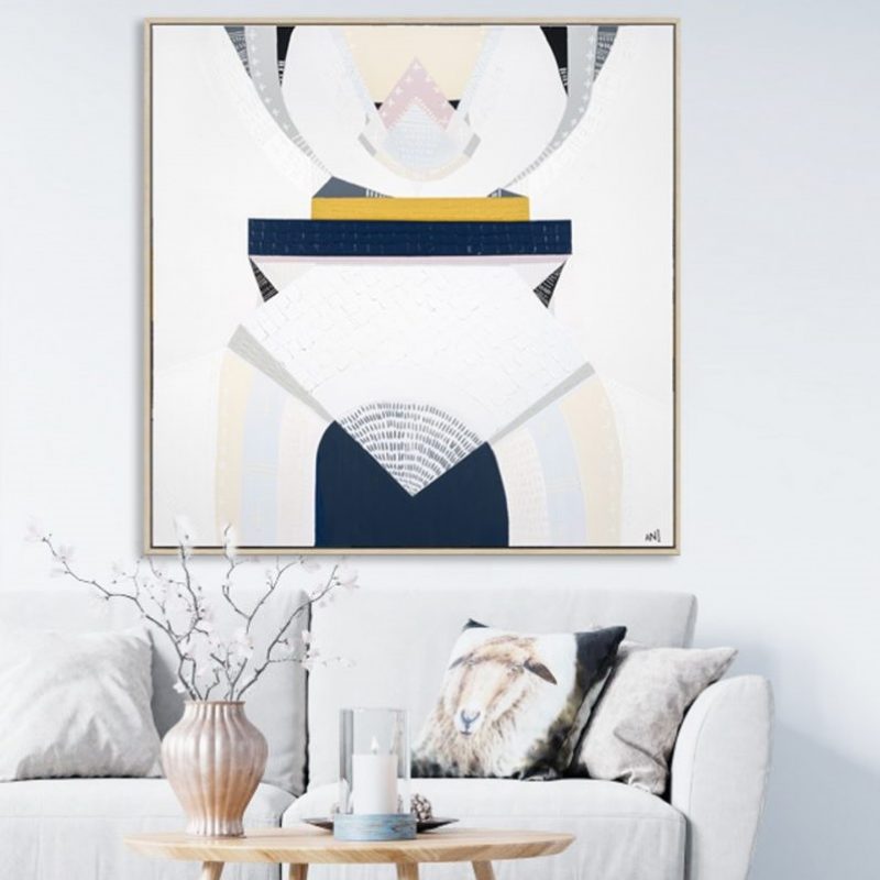 Acrylic and Collage on canvas, artwork size 50 x 50cm – Â Framed in Australian oak. (53x53cm)