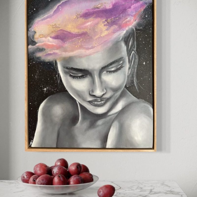 This painting comes framed, the timber colour complement the skin colour of the figure in the work.