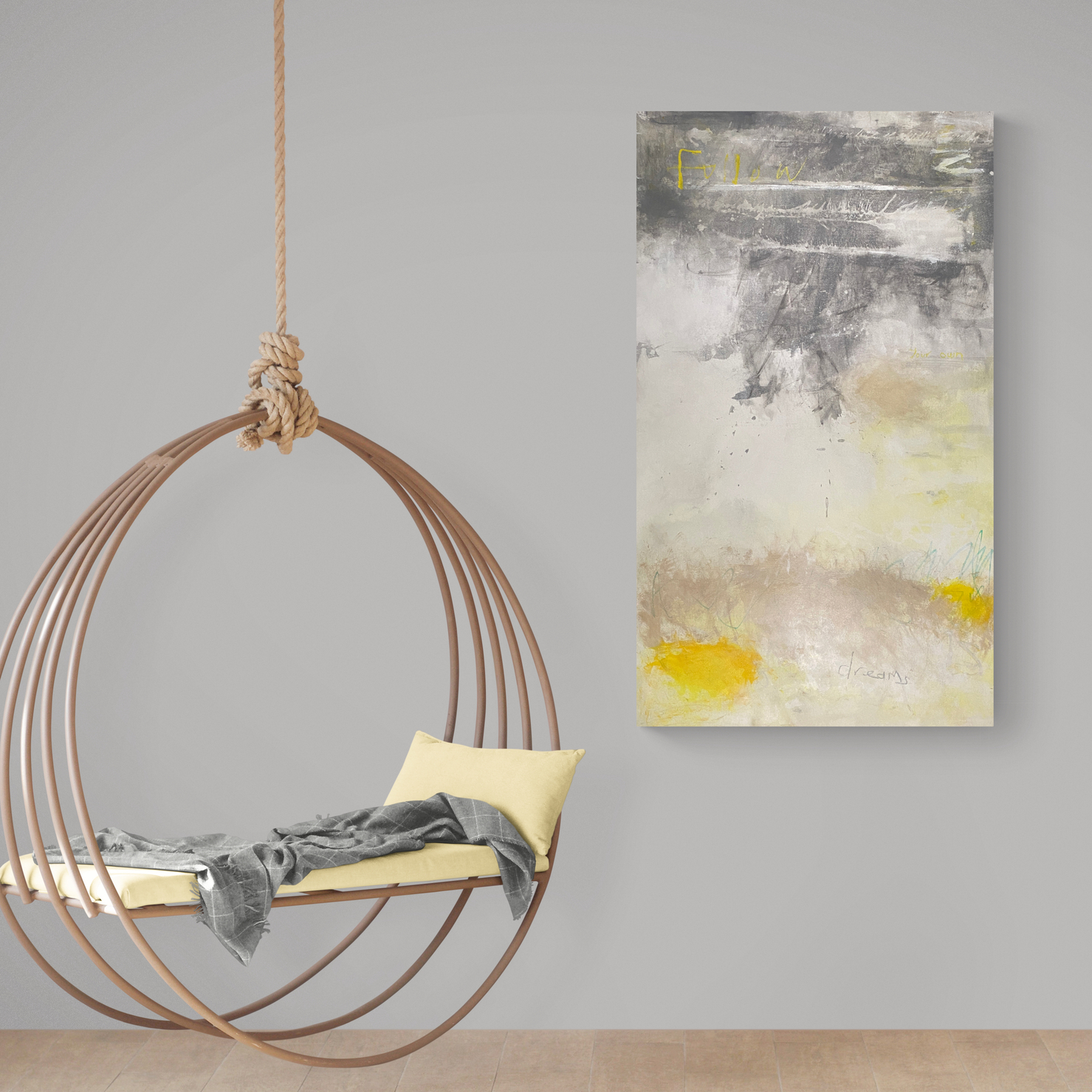 It has a subtle palette of ultimate gray and illuminating cool yellows with warm earthy hues and a lick of green.