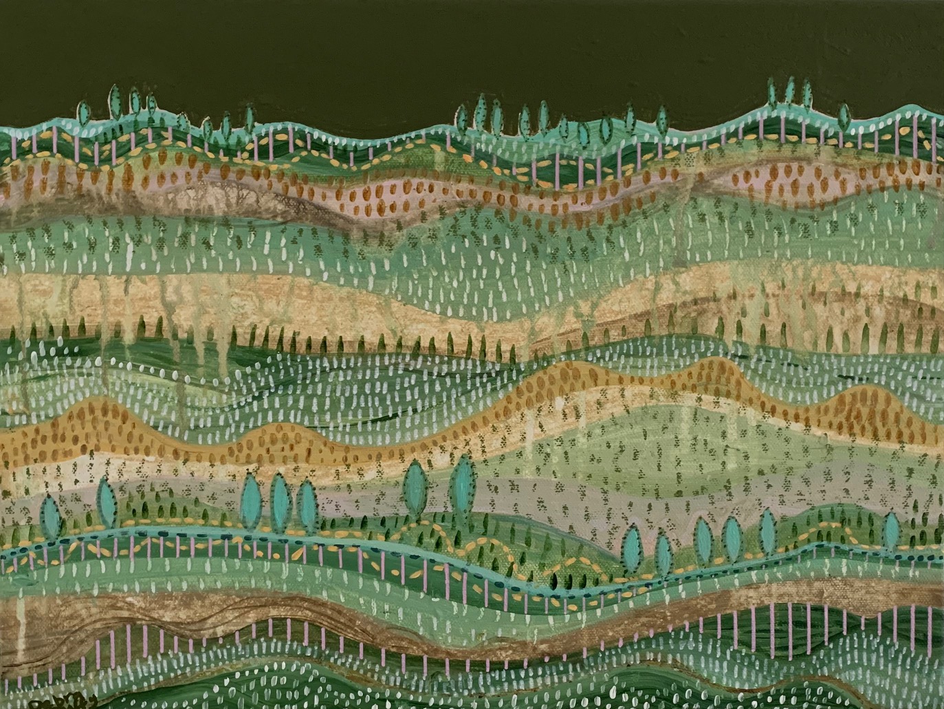 This artwork is an original abstract style landscape painting. I have used Acrylic paint, oil stick and artist markers which I like to merge these mediums creating contrasting textures and organic patterns that harmoniously weave together like a tapestry. For this mini creation I wanted to use an earthy colour scheme as I have been inspired by memories of past travels that included visiting the countryside of the ever so beautiful Italy. ‘Dreamt land’ evokes a terrain where the earth hums softly with rhythmic gentle patterns suggests movement and growth.