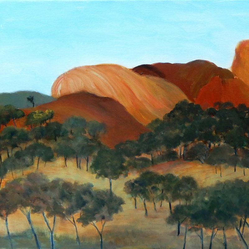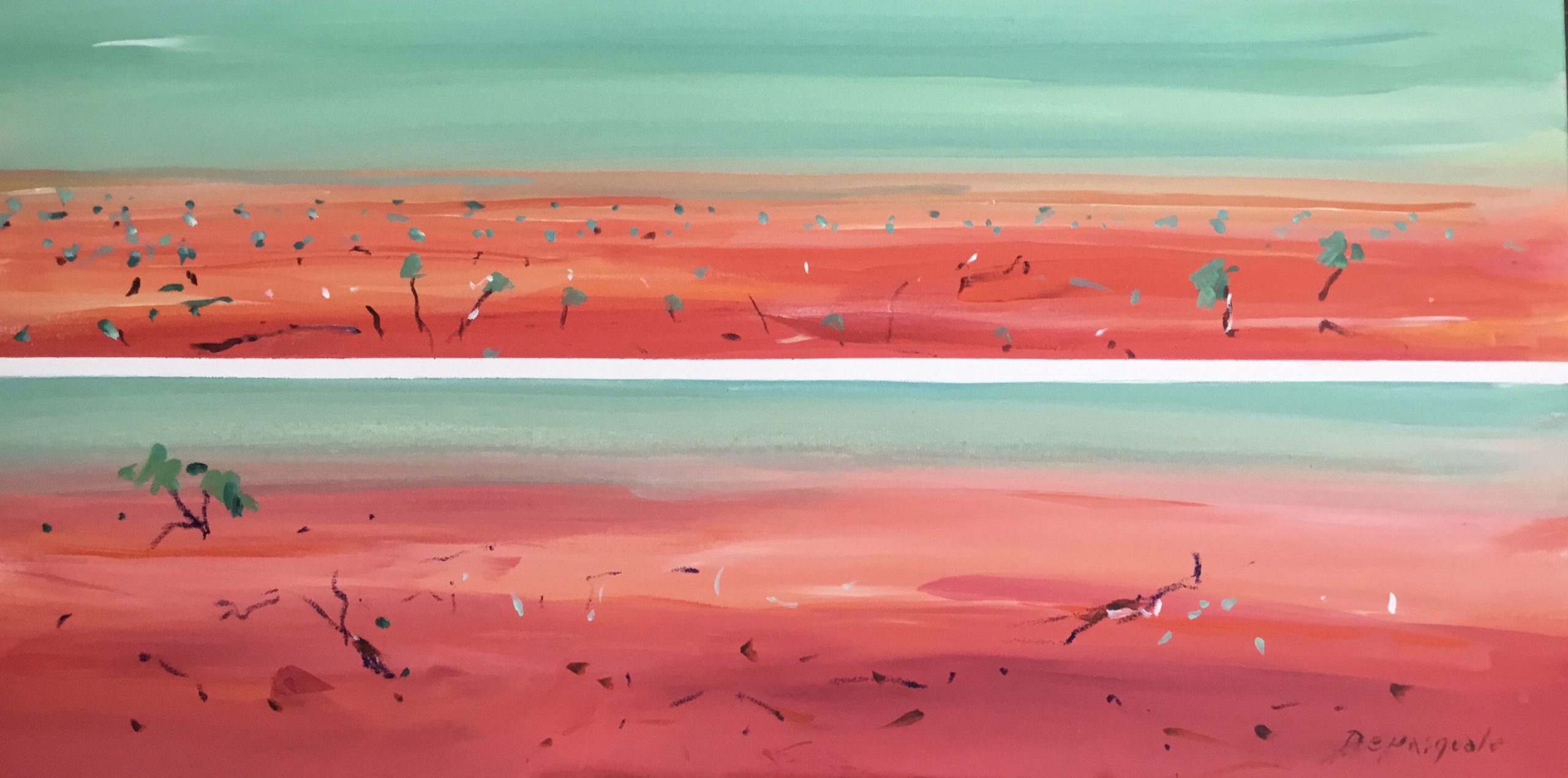 The heightened colour and simplified forms capture the essence of this ancient land. Colour is vibrant rich yet delicate .The depiction of two images creates an opportunity for the artist to view further exploration. A unique piece, wonderful in any setting.