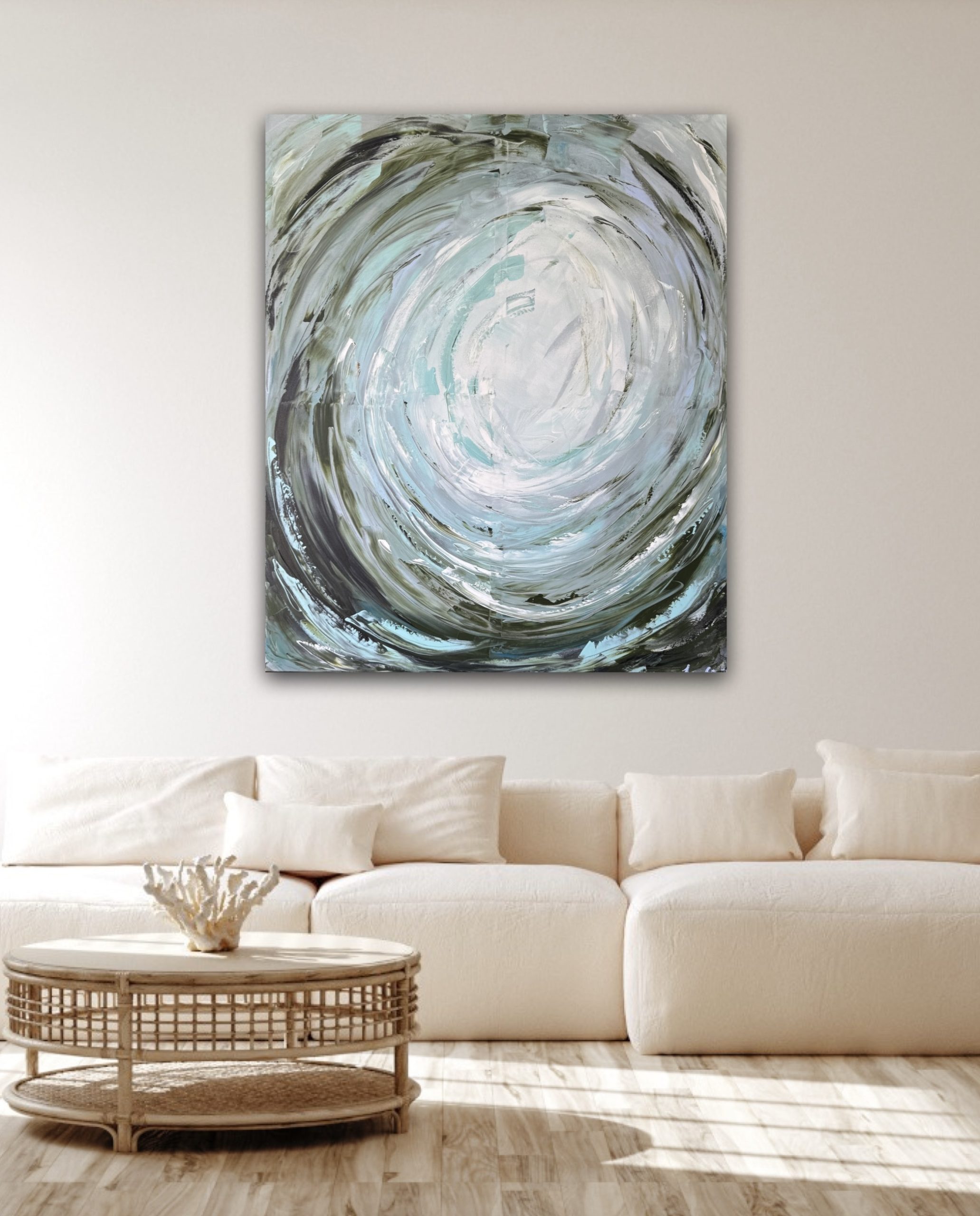 ‘Dreamwave’ features a dynamic swirl of vibrant, ocean inspired colours. Fresh greens, deep blues and hints of teal evoke the energy of a crashing wave. The motion of the brushstrokes adds a peaceful yet powerful feel, it balances serenity and strength making it a captivating statement piece.