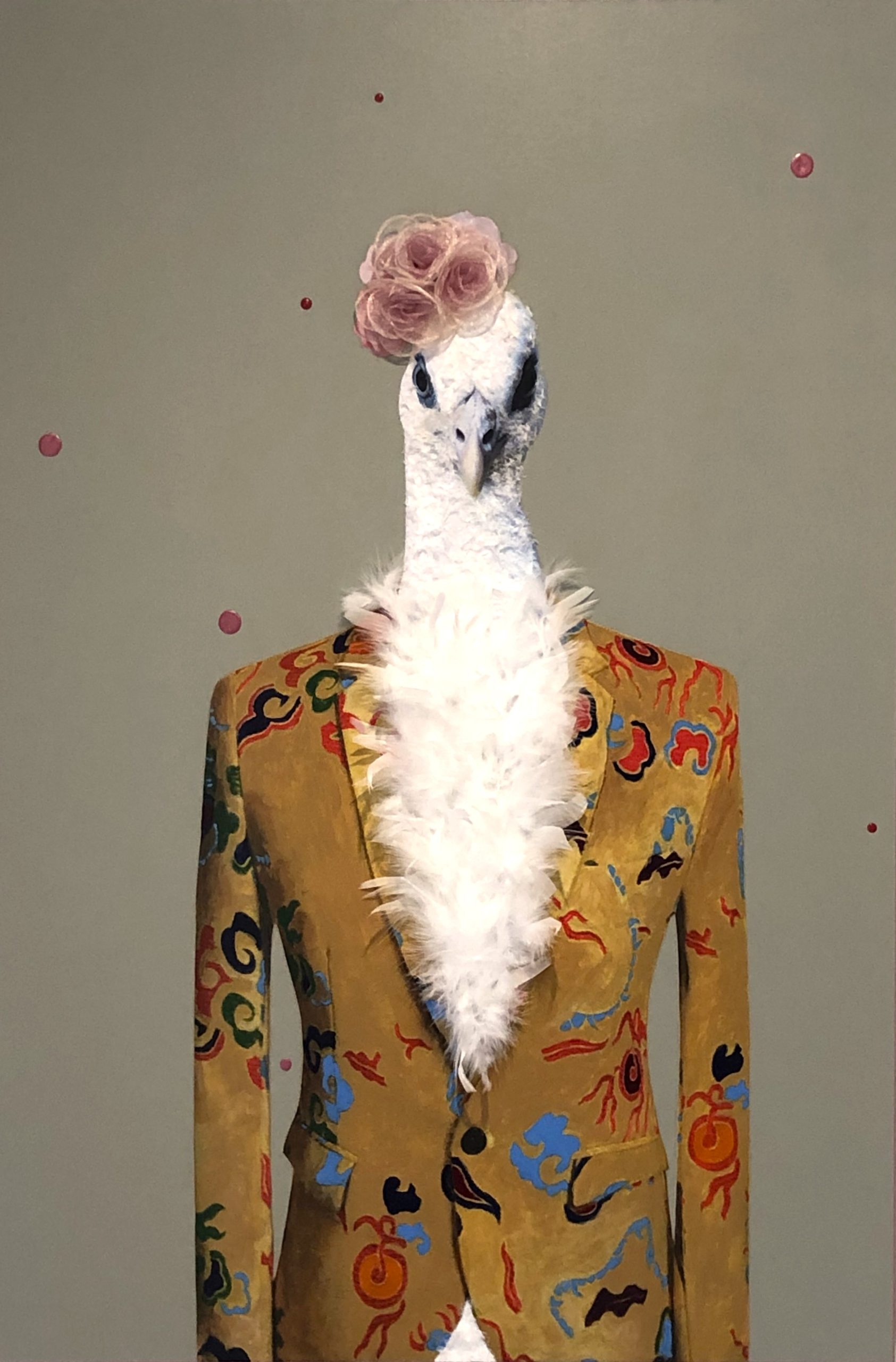 This whimsical and striking portrait blends fashion, fauna, and absurdity in a captivating fusion of elegance and comedy. The bird’s poised demeanor is offset by the plush white plumage spilling from the collar whilst atop its head perches a delicate crown of blush flowers, lending an air of aristocratic charm and theatrical flair. Set against a minimalist backdrop dotted with crimson confetti, the piece invites viewers to delight in the absurd.