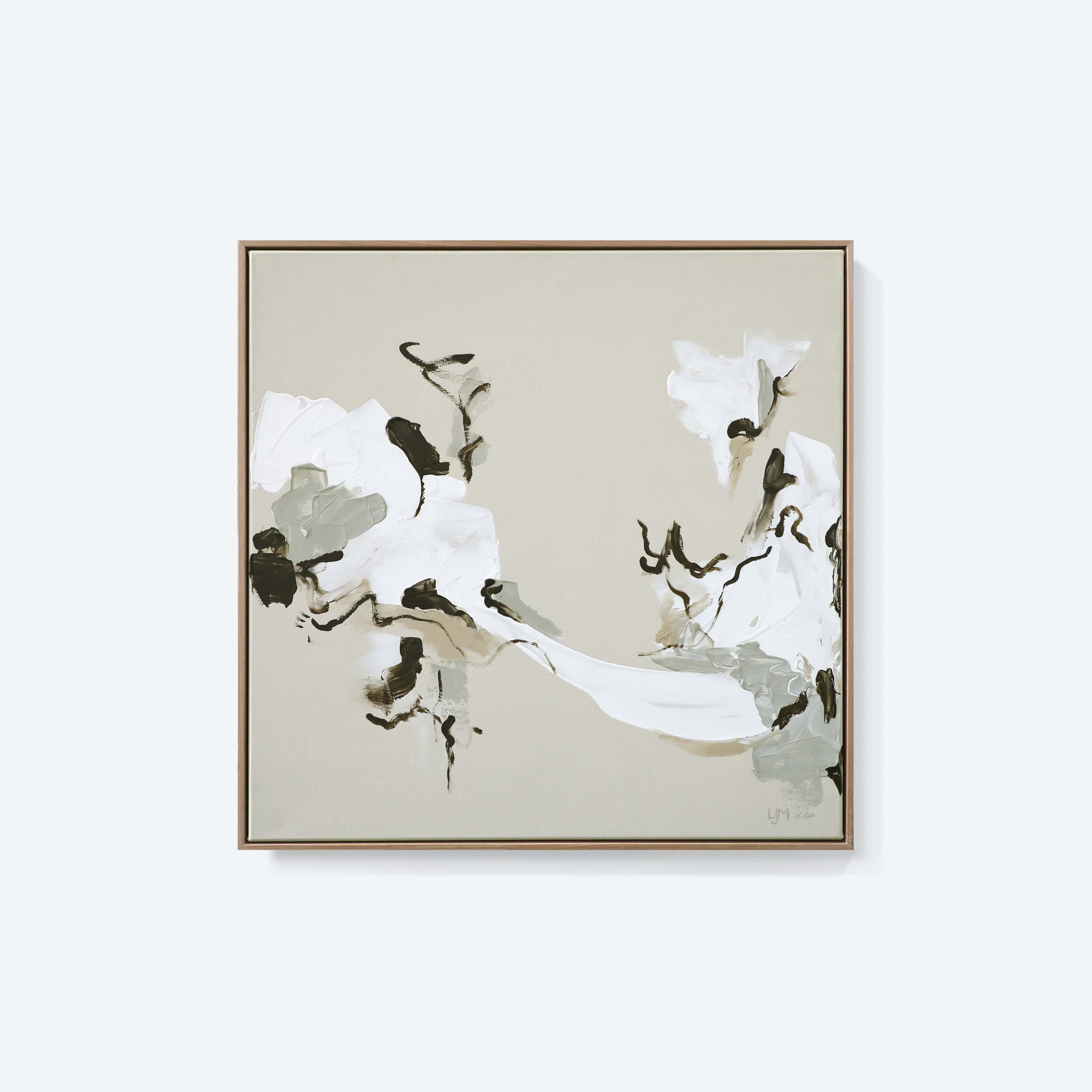 “Drift” is a serene work, inspired by the boundless openness of the sky. Soft neutrals and gentle contrasts mimic drifting clouds against an expansive canvas, creating a sense of lightness and calm. Bold, dark accents add depth and focus.