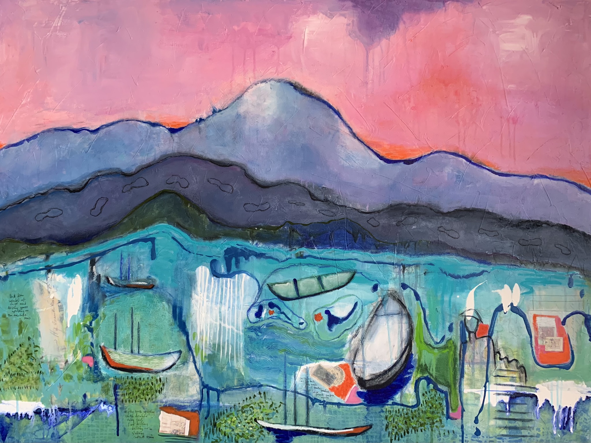 Drifting II by Marijke Lambregtse is the second (first one sold) powerful, thick layered artwork I made on the subject of Lembongan Island. I do love these paintings a lot especially because of the layering and collage of old stamps, letters and parts of this poem ‘Seaweed’ by Henry Wadsworth Longfellow I used in these works. The cultivation of seaweed on Lembongan island is still very strong and a great source of income for the local population especially when things like COVID happen and there are no tourists so at least they can go back to what original their way of living was which is great. I loved the little boats and the coral (of which sadly is not much left), hence the beautiful orange pigment I used and sea animals we saw and especially the spectacular sunsets, so incredible. So this painting is all influenced by that. As usual in my latest works there is the little guardian you can find in the work who’s been protecting me while living in Bali.