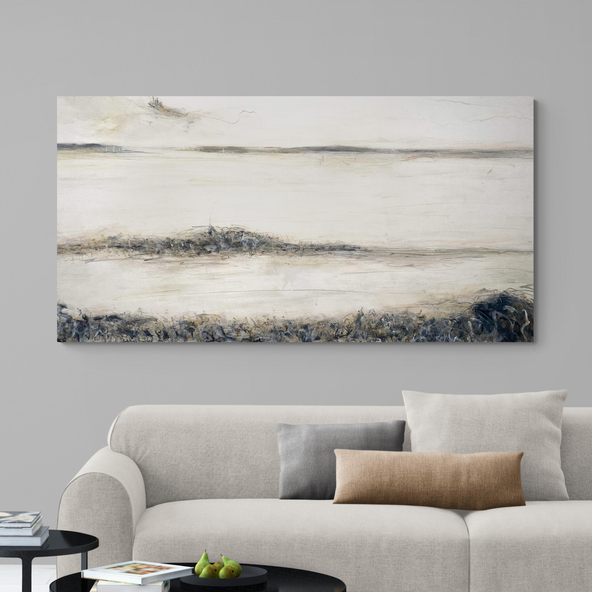 Drifting Sands is an original painting by Cheryl Harrison. It was inspired by sketches made on the beach. It’s intriguing expressionist mark making combined with its restful and calm neutral palette is the perfect statement piece for a large space.