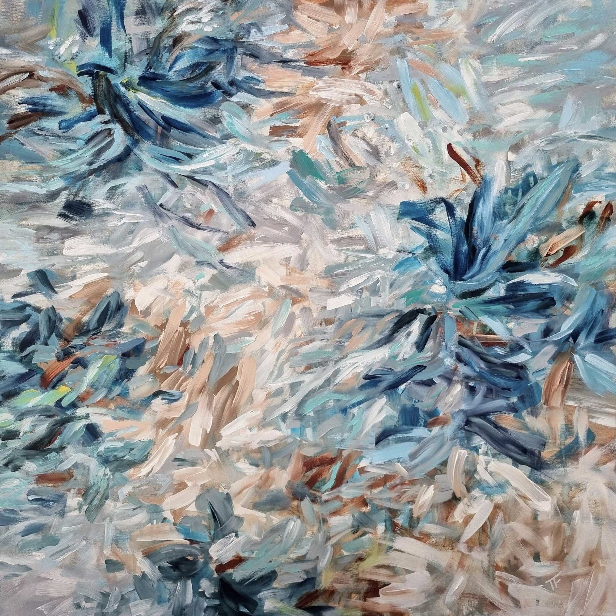 Drifting Whispers is a gentle, atmospheric abstract painting inspired by the fleeting movement of wind through foliage and the softness of whispered motion. Created in acrylic on canvas, this piece features loose, expressive brushstrokes in layers of muted blues, warm neutrals, soft whites and earthy greys.