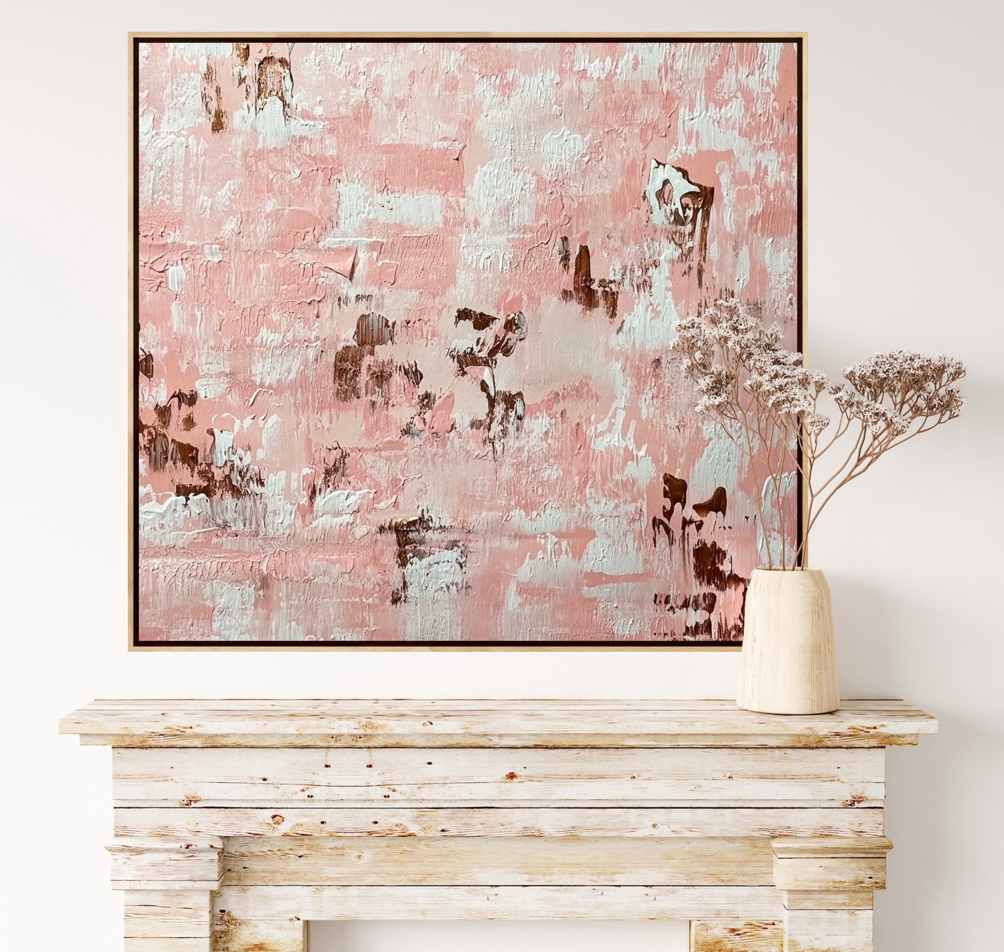 Driftwood Daydream, by Alanah Jarvis, is a breezy escape into seaside nostalgia. With its sun-kissed palette of blush pink, creamy white and driftwood brown, this textured abstract painting feels like a lazy afternoon walk along the shore. With salt in the air, cracked shells on the shore and sand between your toes. Each brushstroke hints at playful tides and forgotten treasures washed ashore, blending carefree joy with natural elegance.