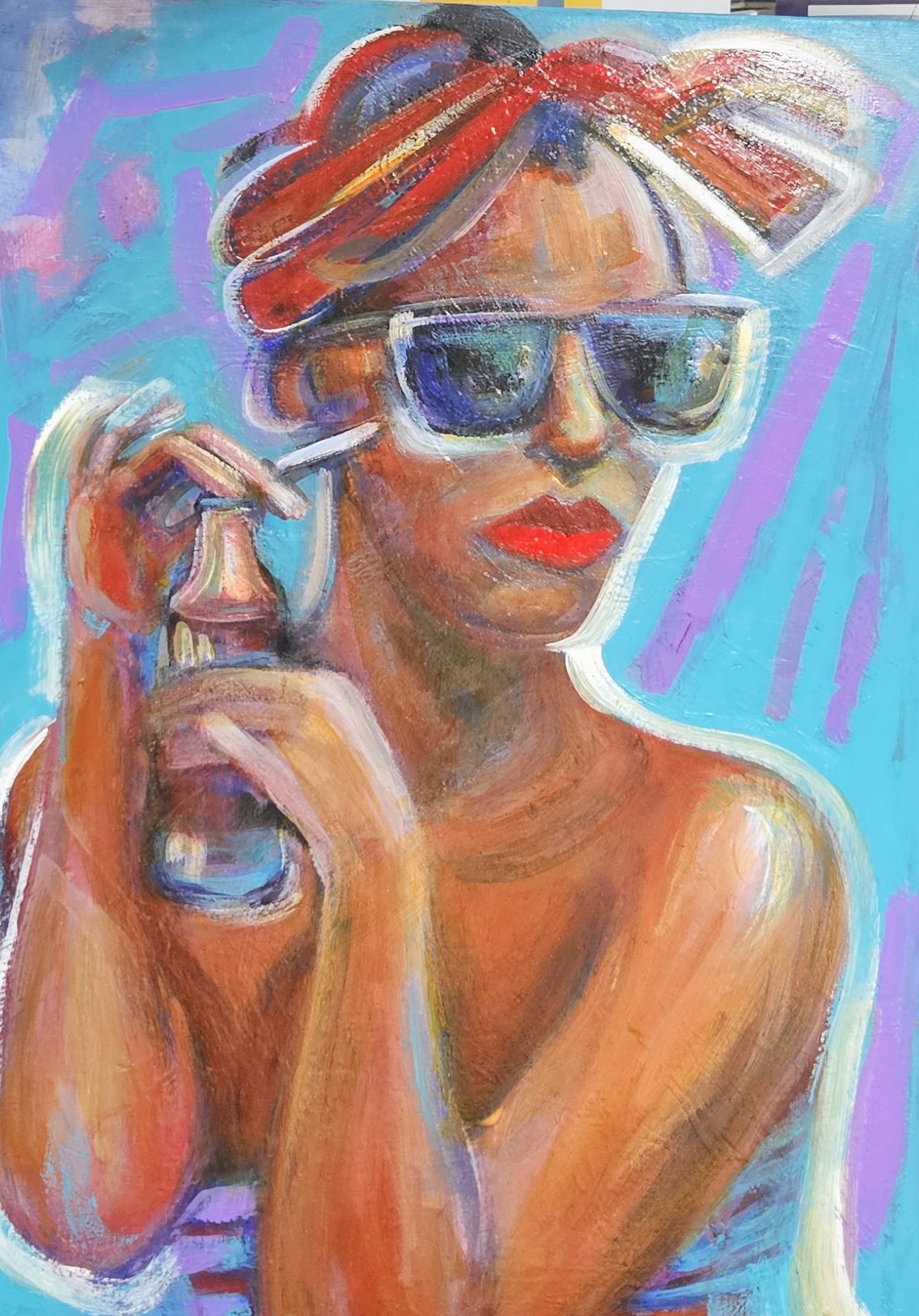 Modern pop art girl day dreaming .contrast hues of colour brings her to life on canvas