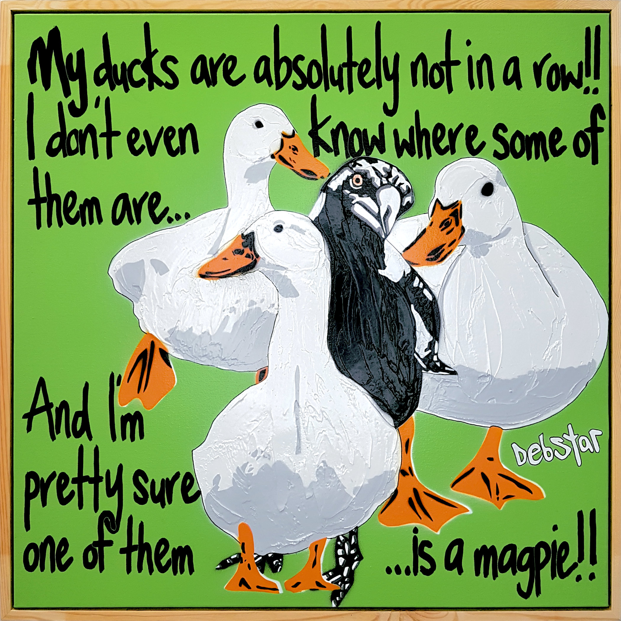 Ducks in a Row! -green #1 by Deborah Lang – Add some cute to your home with these ducks and cheeky magpie!