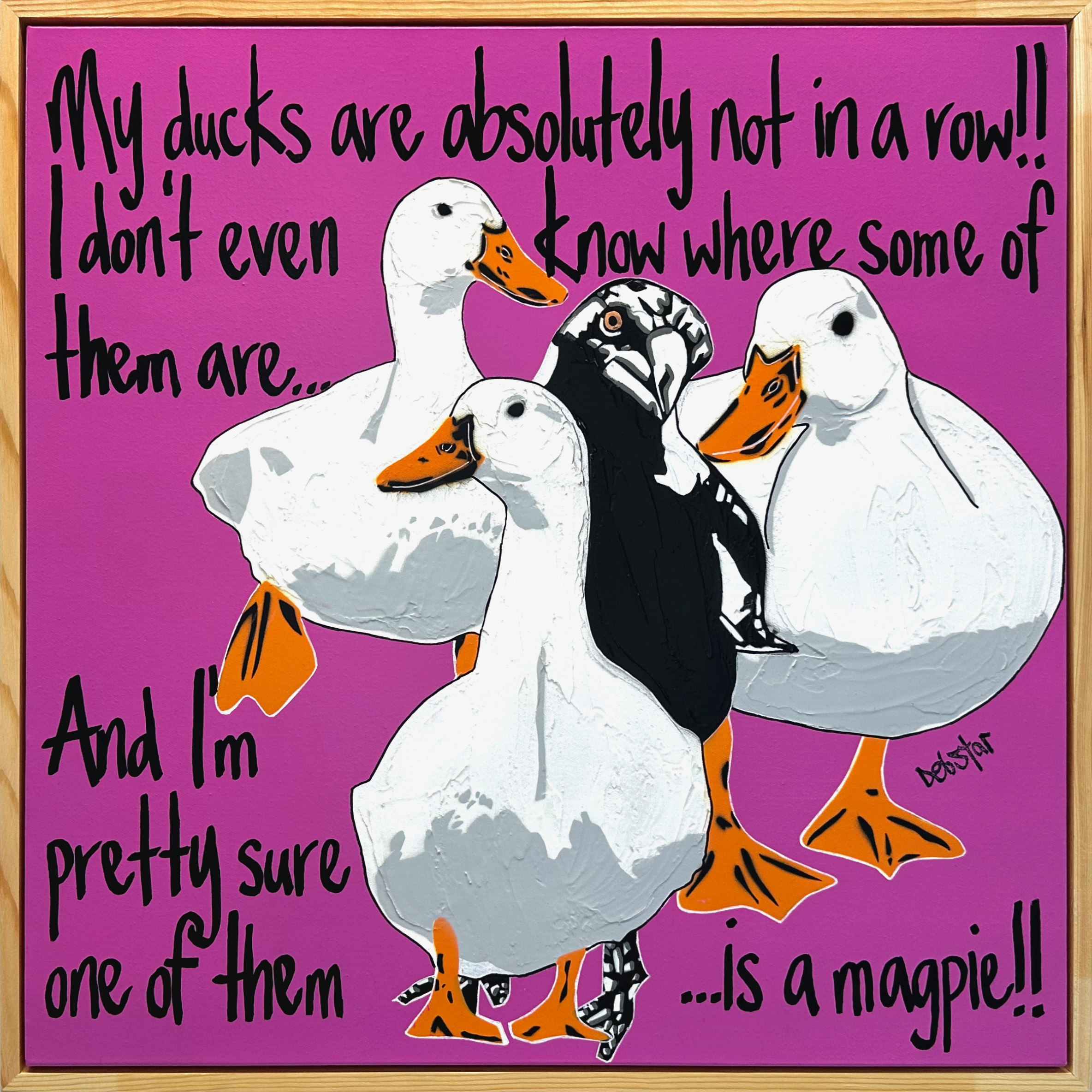 Ducks in a Row magenta 2 by Deborah Lang – Add some cute to your home with these ducks and cheeky magpie!