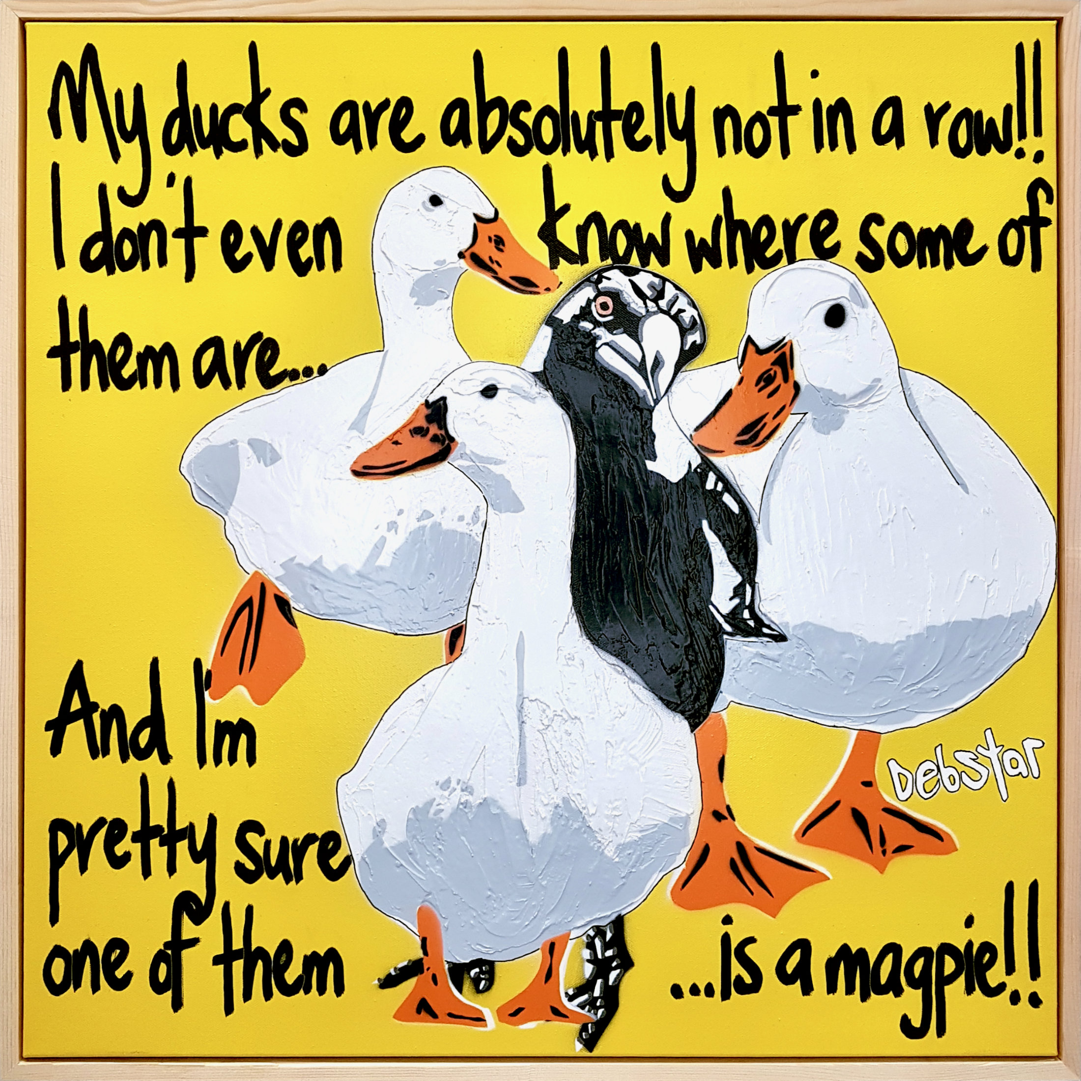 Ducks in a Row!  2-yellow by Deborah Lang – Add some cute to your home with these ducks and cheeky magpie!
