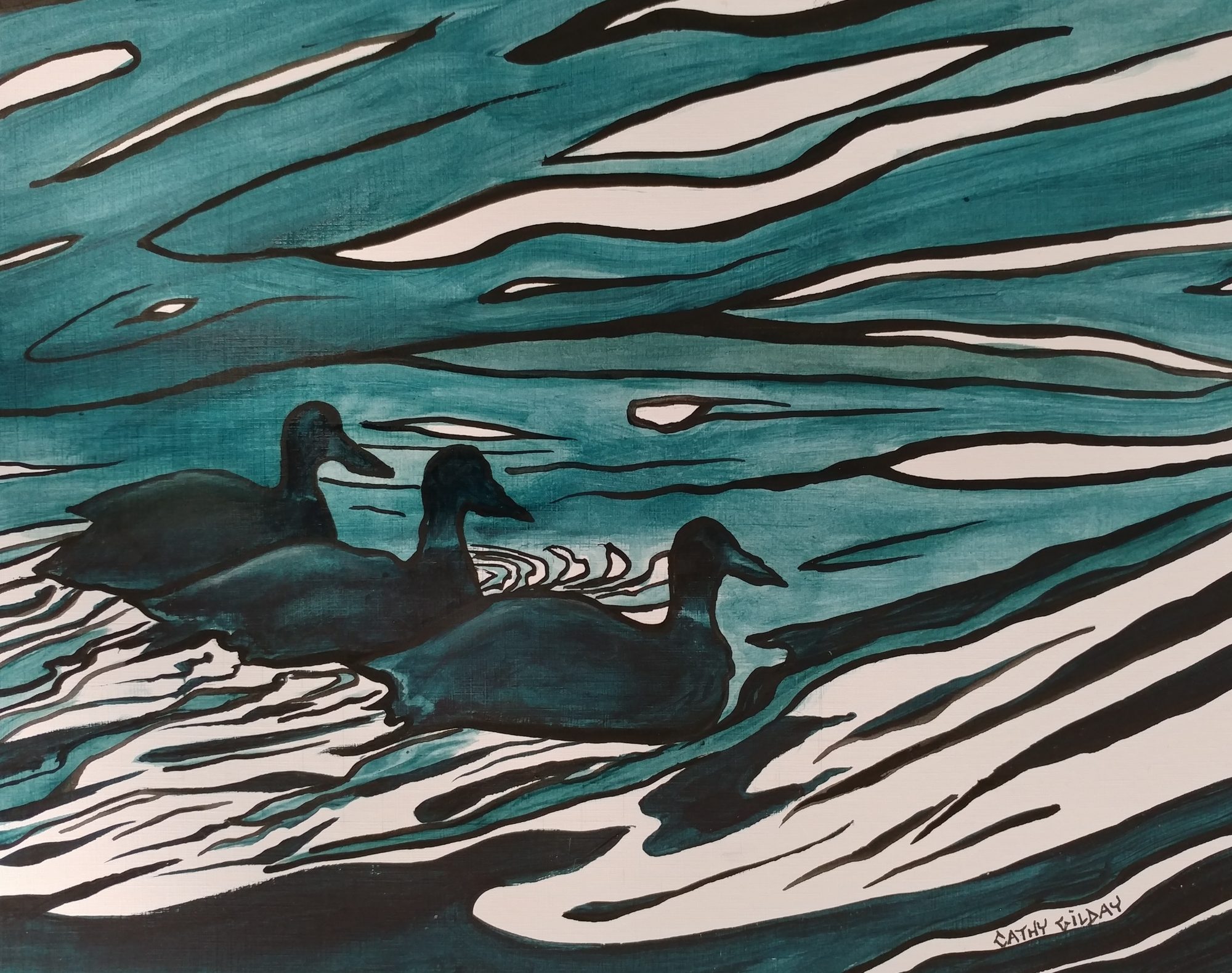 Ducks in a Row by Cathy Gilday – I love the way ducks line up together in nature, as if performing in a syncronised swimming performance! I kept the palette limited in this piece , which I think adds to the patterns of the water. Requires framing.