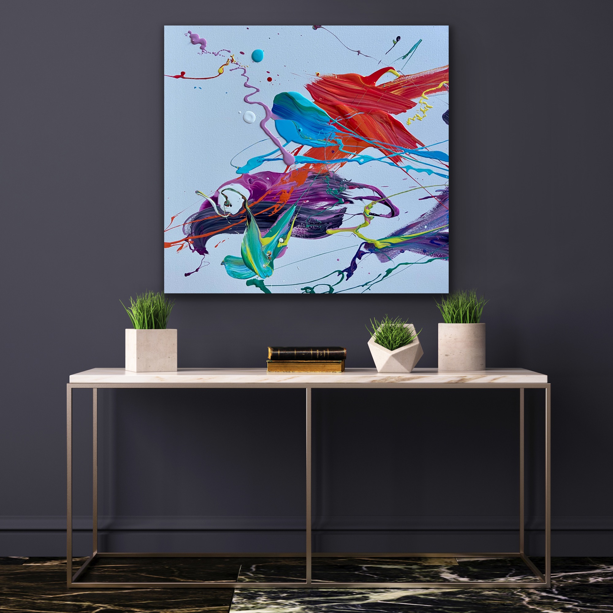 Eagle and the sparrow by Jonathan Redmayne. A New abstract action painting . A powerful piece with beautiful brush strokes. Dynamic colours exploring shape, form, rhythm and movement. Painted on 2th of February 2022. The 2nd piece of the new exciting ongoing body of work for 2022.